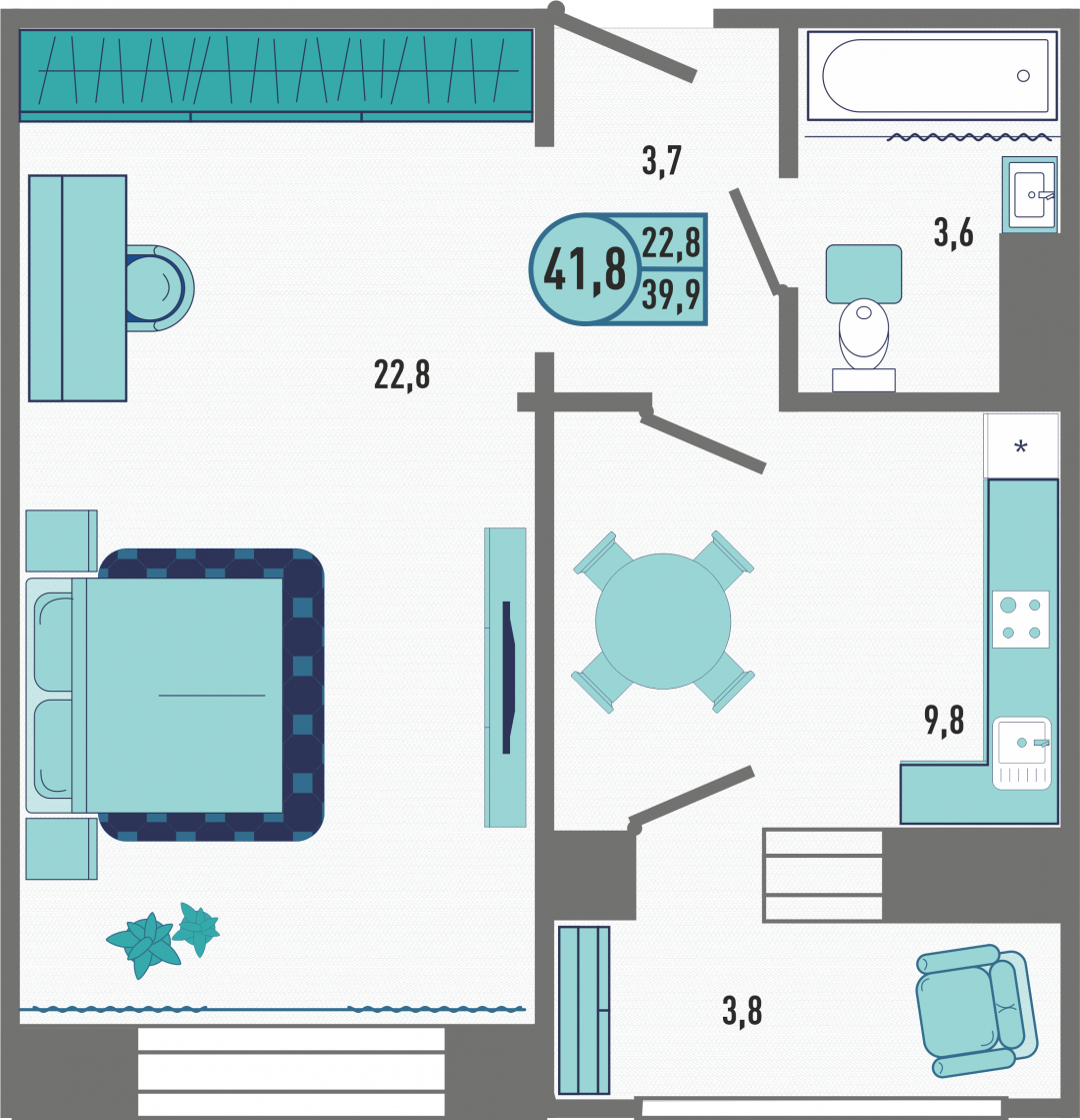 Площадь квартиры – 41.8 кв.м.