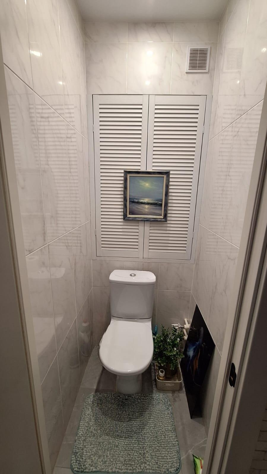 Санузел раздельный, стены покрыты плиткой под белый мрамор.