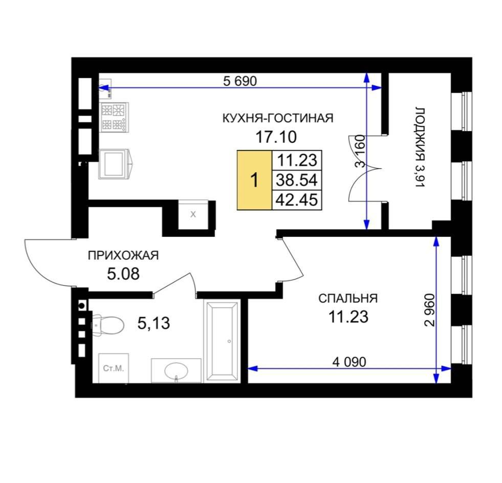 В продаже однокомнатная квартира №11 на 3 этаже в ЖК , площадь 42,45м.кв. от застройщика ЖК ВКлючи.
