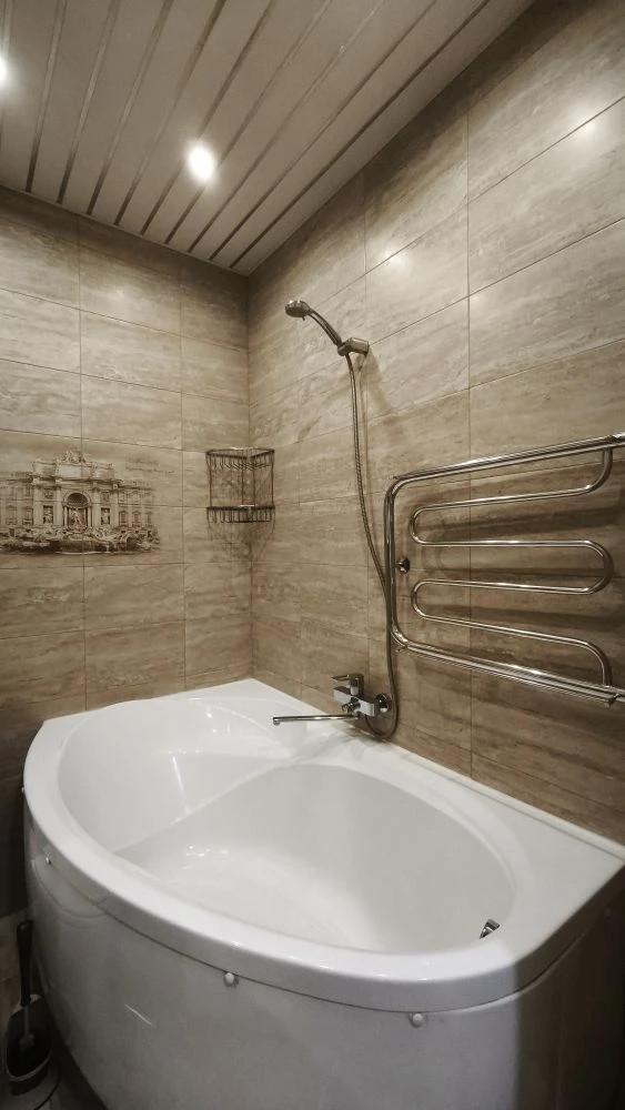 Потолки во всей квартире, кроме ванной комнаты, подшивные — армированный стеклотканью ГКЛ Кнауф по обрешётке из металлопрофиля, в ванной комнате — реечный алюминиевый.