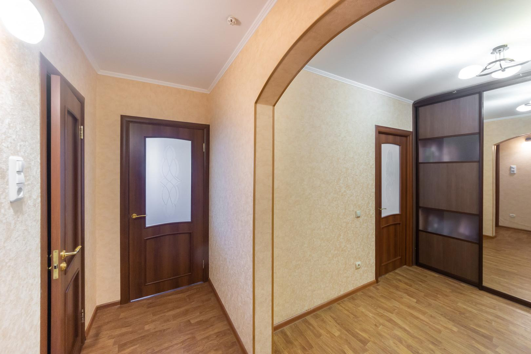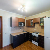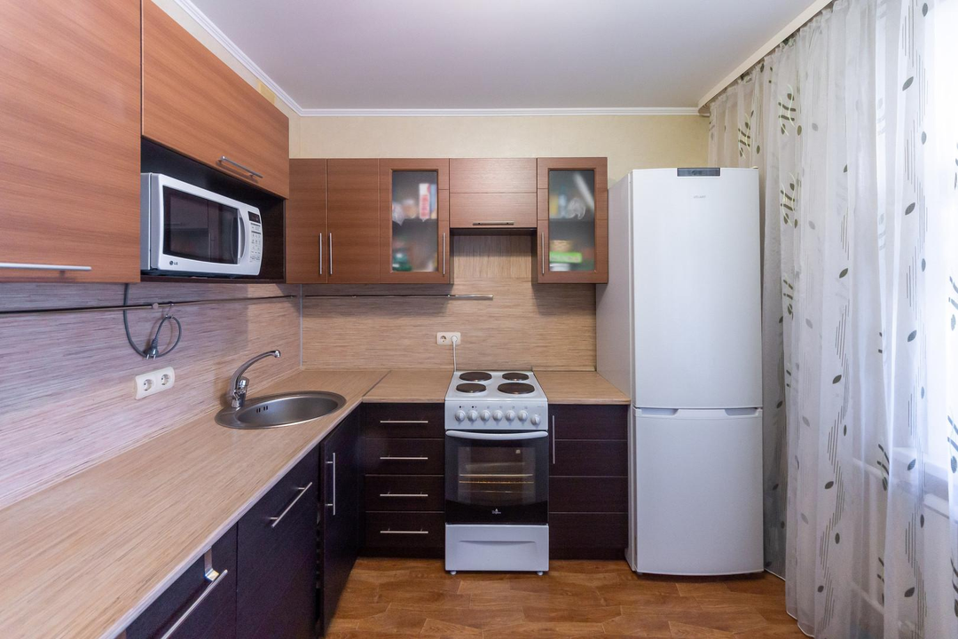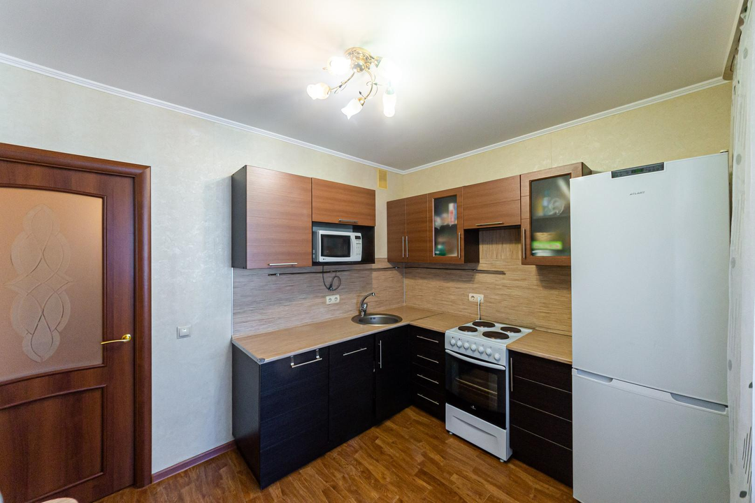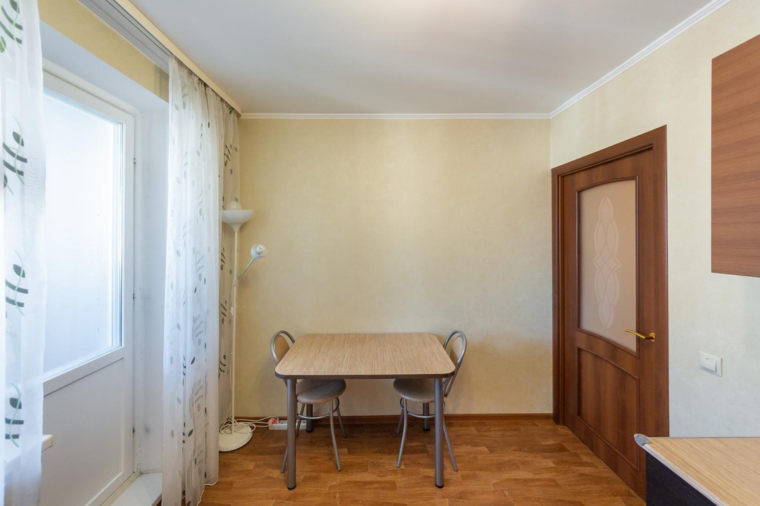 Квартира с ремонтом в теплых тонах. Уютная кухня с выходом на балкон, оборудована для проживания.