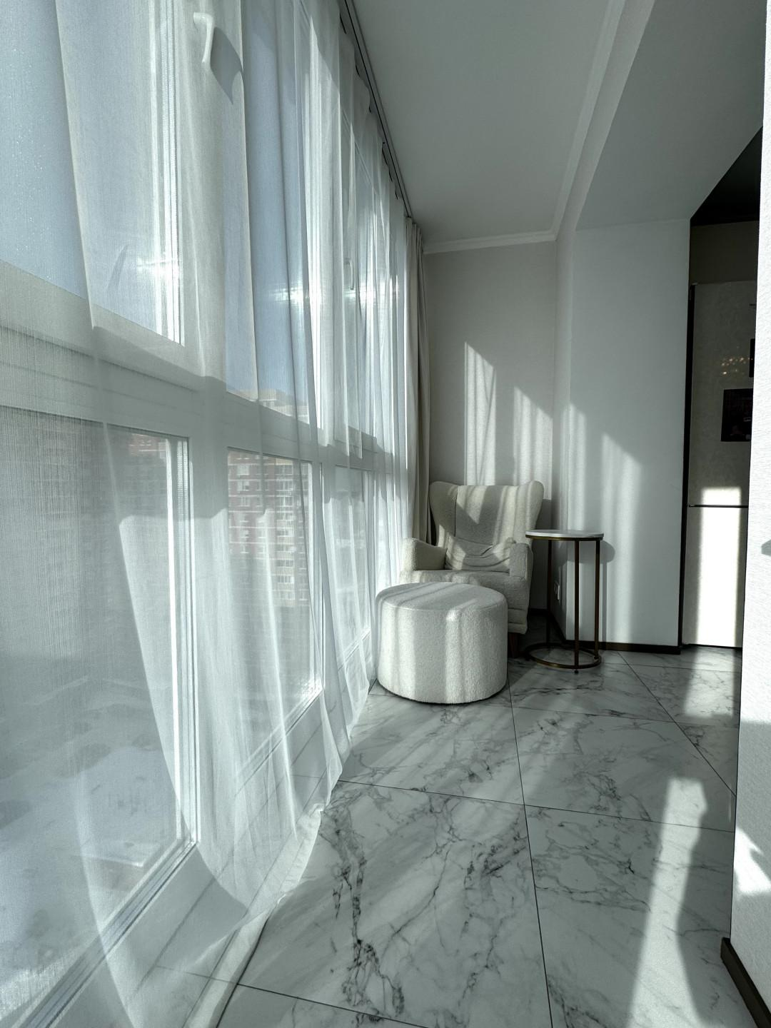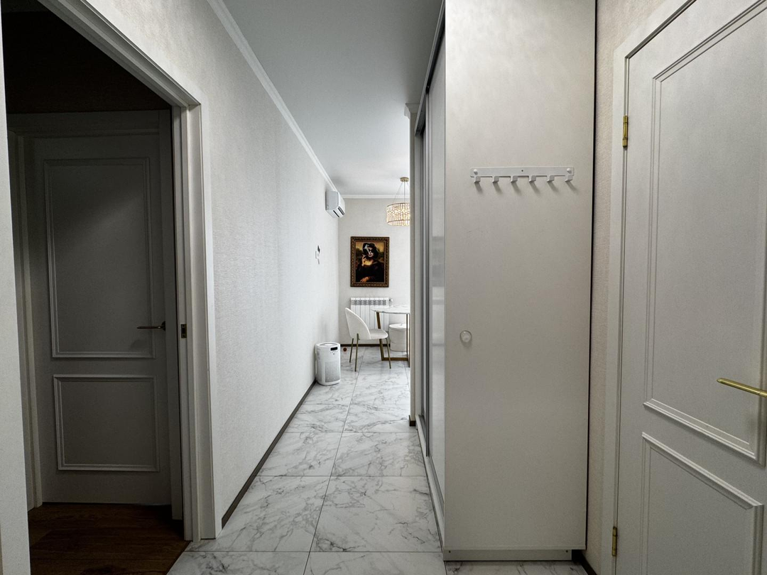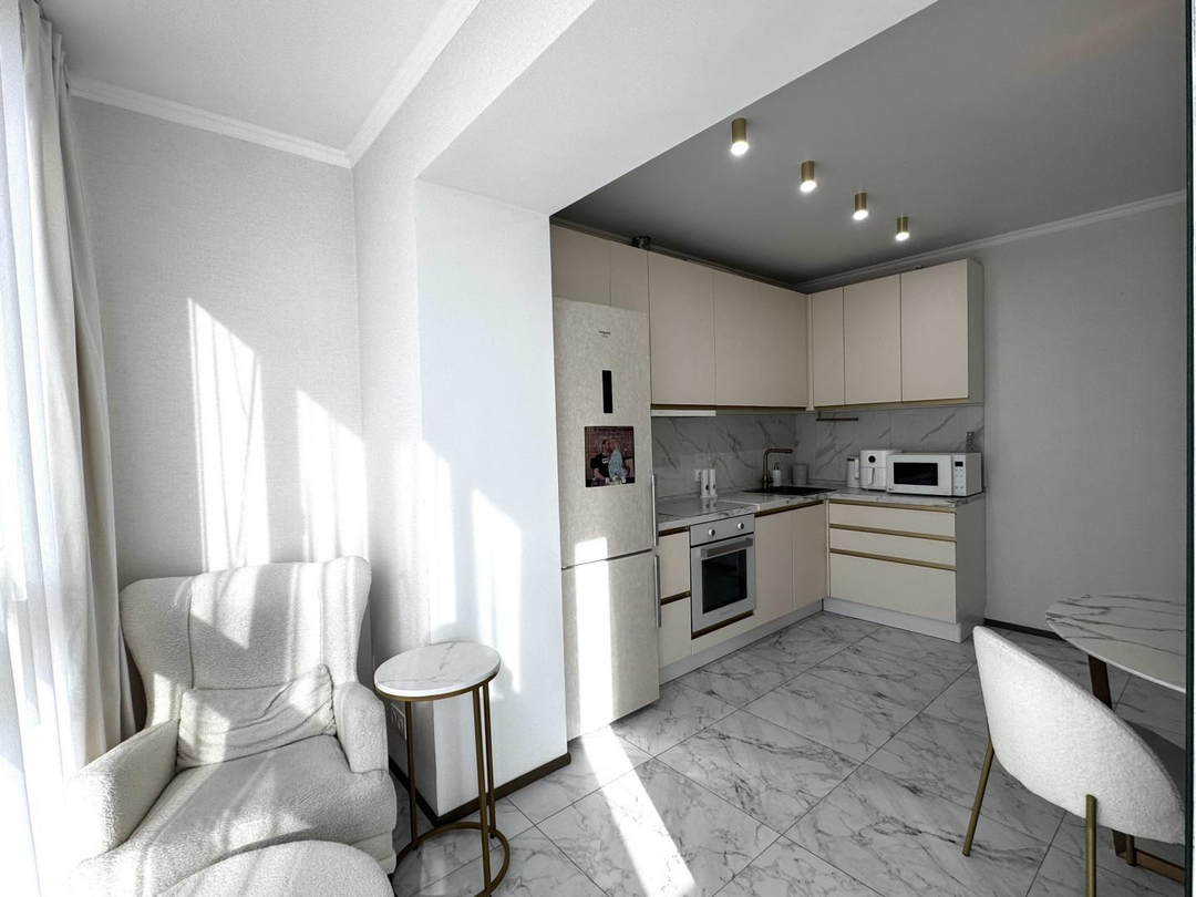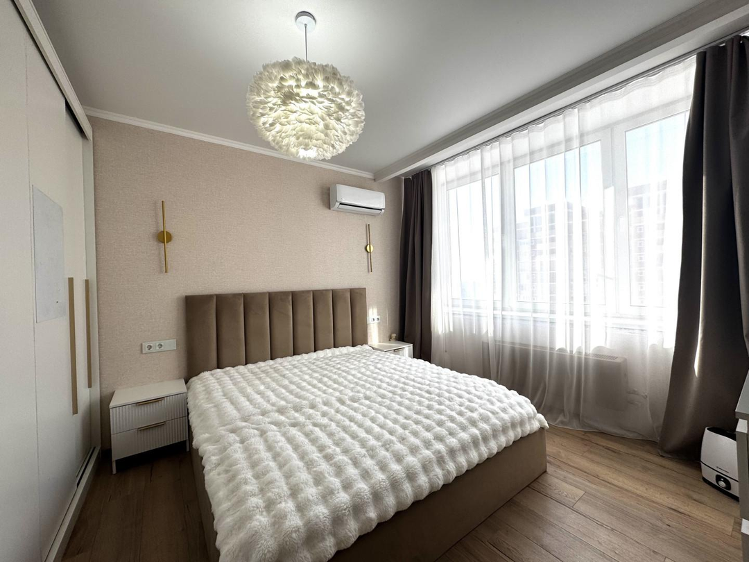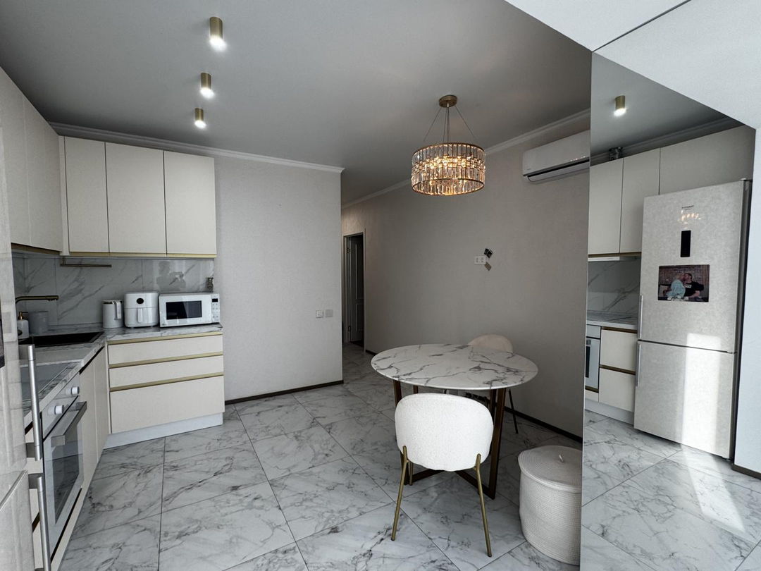В квартире выполнен качественный, дизайнерский ремонт. Отдельная спальная комната, кабинет, просторная кужня с застекленой лоджией, теплые полы, кондиционер. Соседи прилиные. Подъезд чистый, ухоженный. Во дворе детские и спортивные площадки.