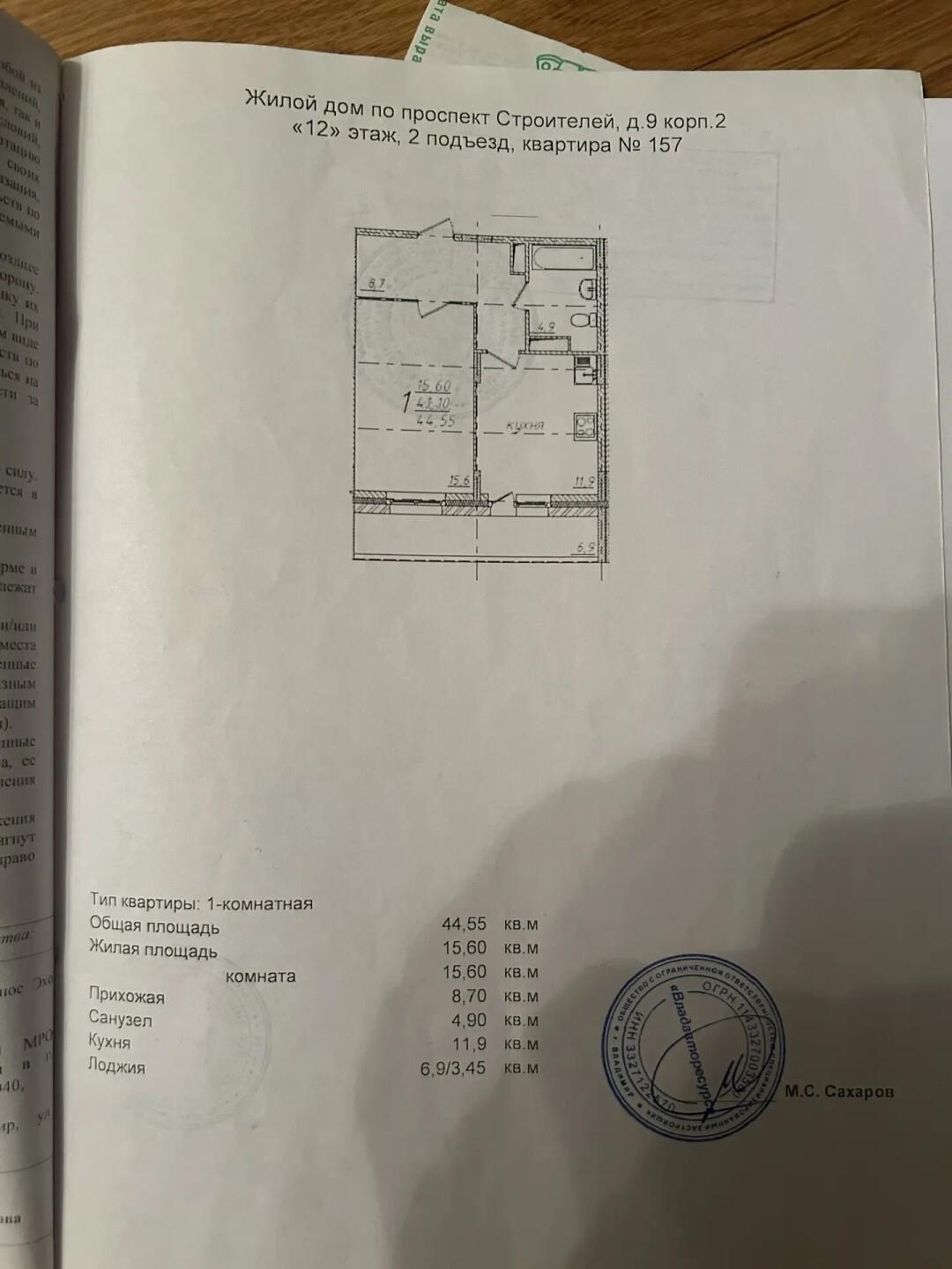 1-комнатная, уютная квартира площадью 44.55 кв.м.. С просторными правильной прямоугольной формы комнатой 15.6 кв.м. и кухней 11.9 кв.м., а также имеется гардеробная комната и просторный санузел 4.9 кв.м.. Квартира располагается на 12 этаже 19 этажного кирпичного дома что обеспечивает хорошую освещенность в любое время года. В квартире выполнен качественный предчистовой ремонт к которому прилагается проект, установлена красивая прочная дорогостоящая дверь, полностью выполнена электроразводка. Все грязные работы завершены, стены полы и потолки идеально ровные.