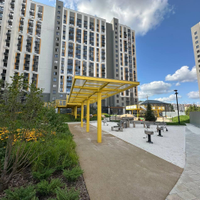 Концепция благоустройства сделана по специальному архитектурному проекту, с малыми архитектурными формами из металла с желтыми цветовыми акцентами, гармонирующими с фасадом домов. Для детской площадки предусмотрены игровые комплексы из натурального дерева в эко-стиле. Предусмотрено продуманное озеленение по дендроплану с автополивом и разноуровневое наружное освещение.