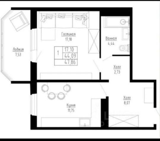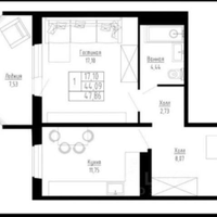 1-к. квартира, 44 м²