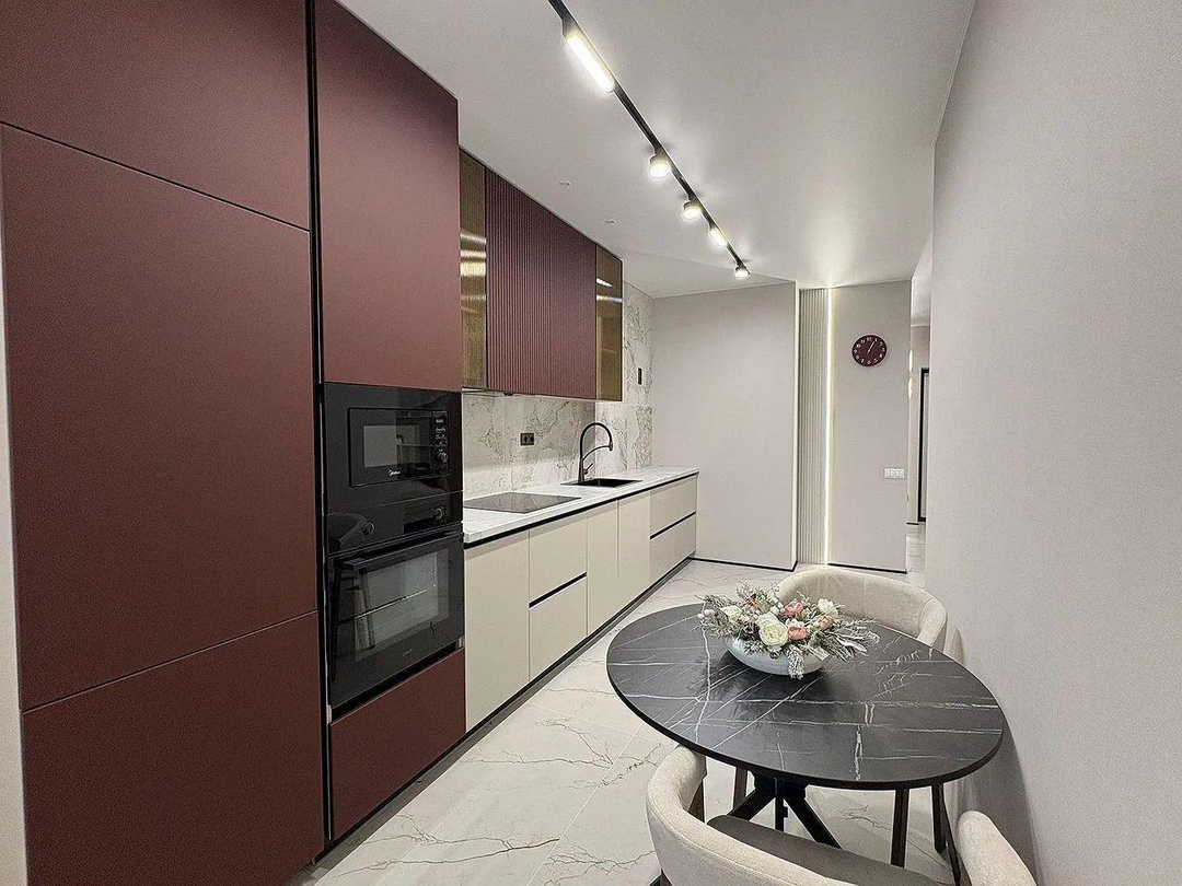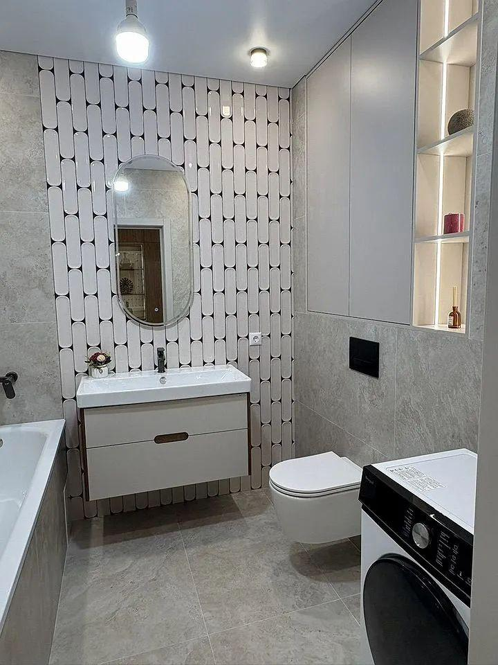 Уютная зона отдыха и функциональная кухня объединены в едином пространстве, создавая атмосферу легкости и современности. Ванная комната оформлена с акцентом на детали и стиль, отражая изысканный вкус владельца.