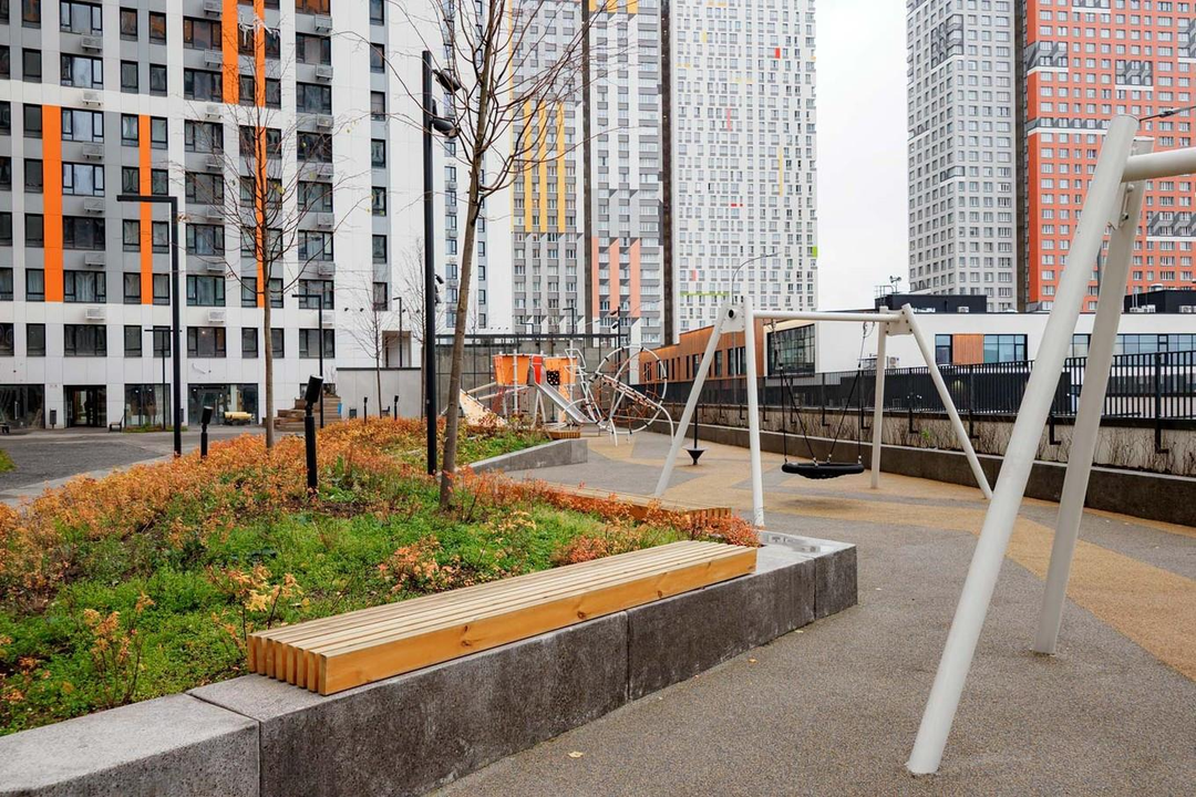 - Уютный двор с тропинками и качелями (пространство закрыто от машин