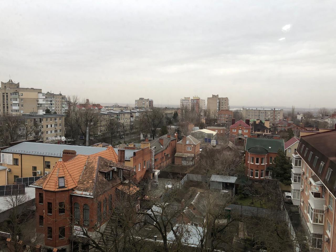 Из окна открывается живописный вид на озелененный город.