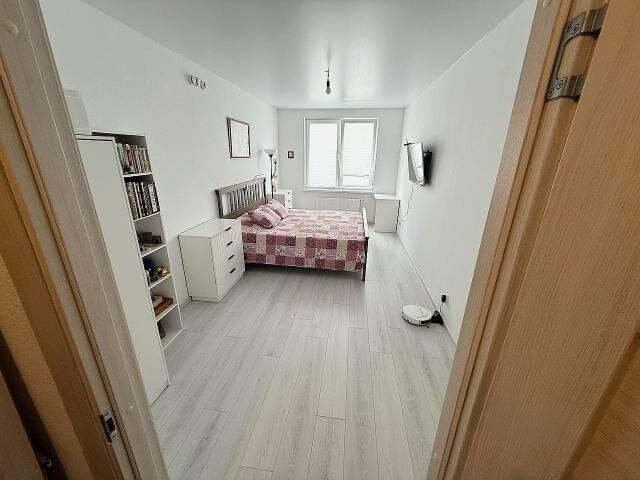 Плед, чашка кофе, завораживающий закат, сменяемый огнями вечернего города.Спальня 17 м² правильной формы — никаких проблем с расстановкой мебели.