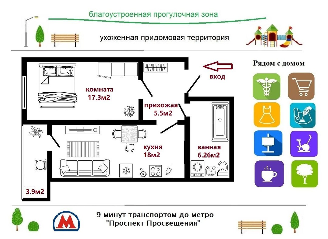 9 мин. -метро Проспект Просвещения