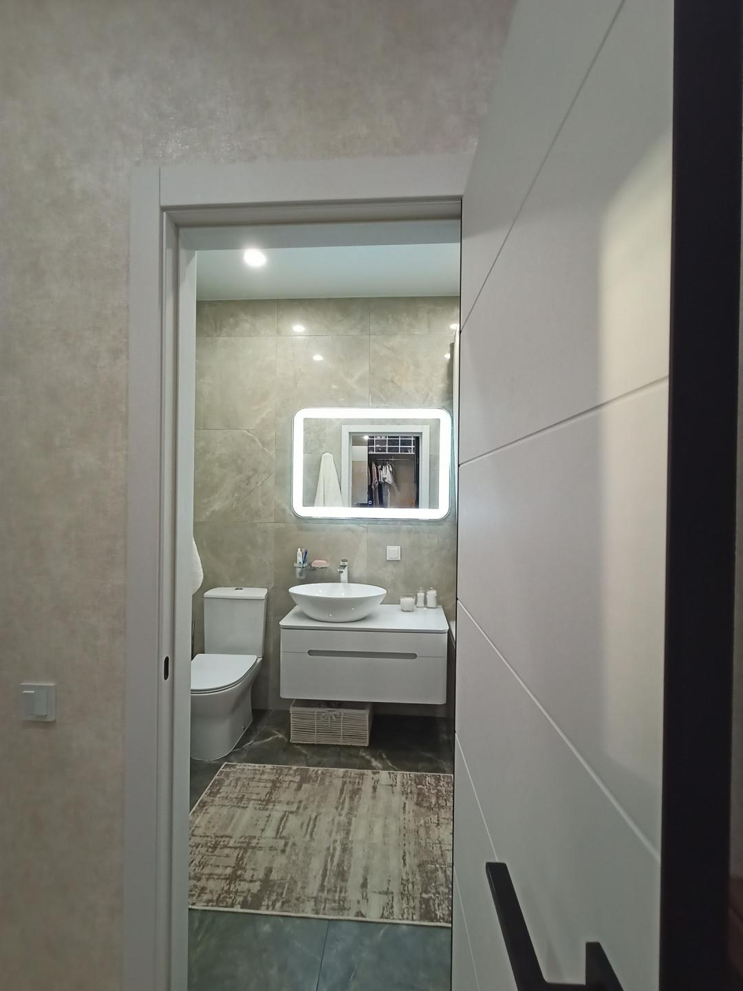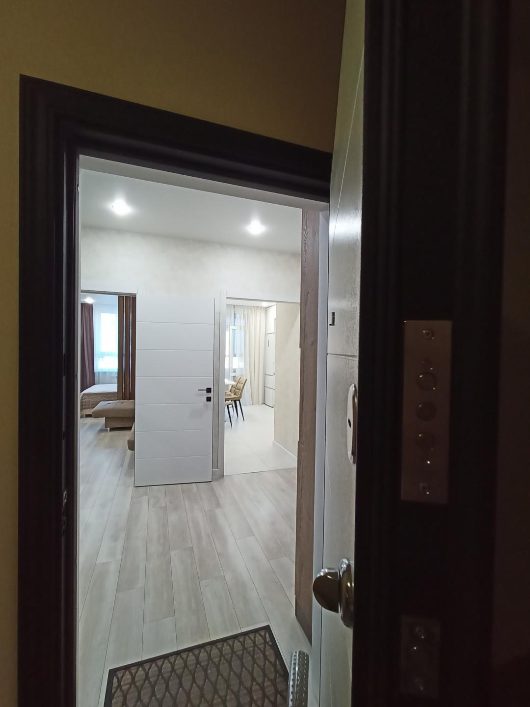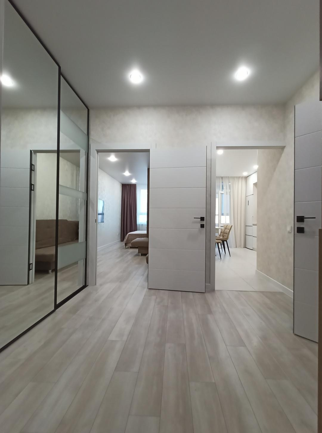 Межкомнатные двери очень высокого качества. Стены идеально выровнены по правилу и маякам. Поклеены качественные обои. Сделан хороший свет во всех помещениях.