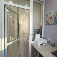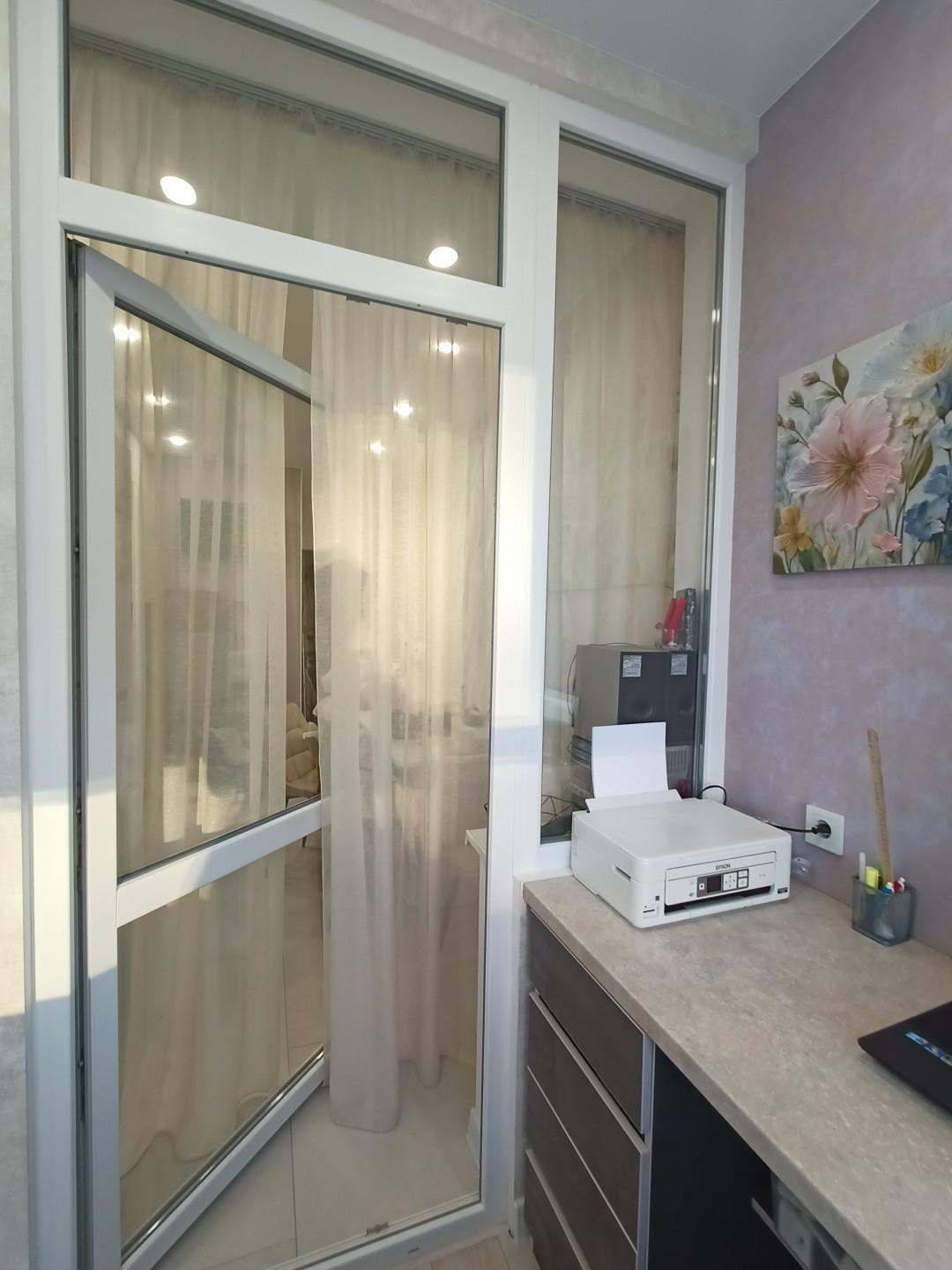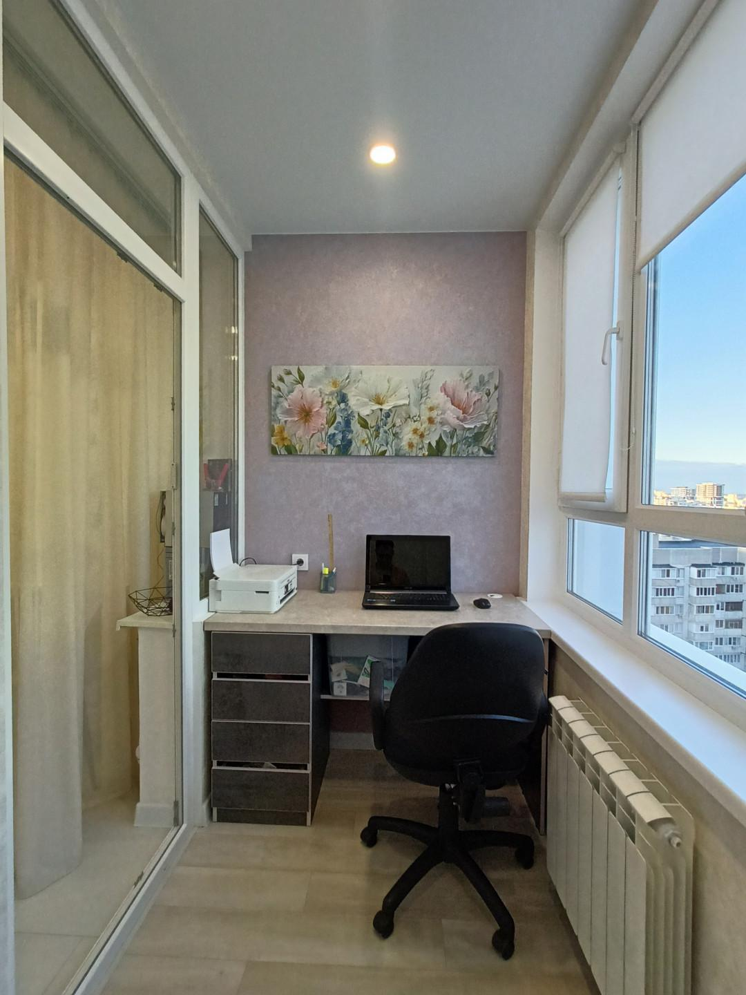 Из кухни выход на теплую лоджию, где оборудован рабочий кабинет. Там же идеальное место для сушки белья.