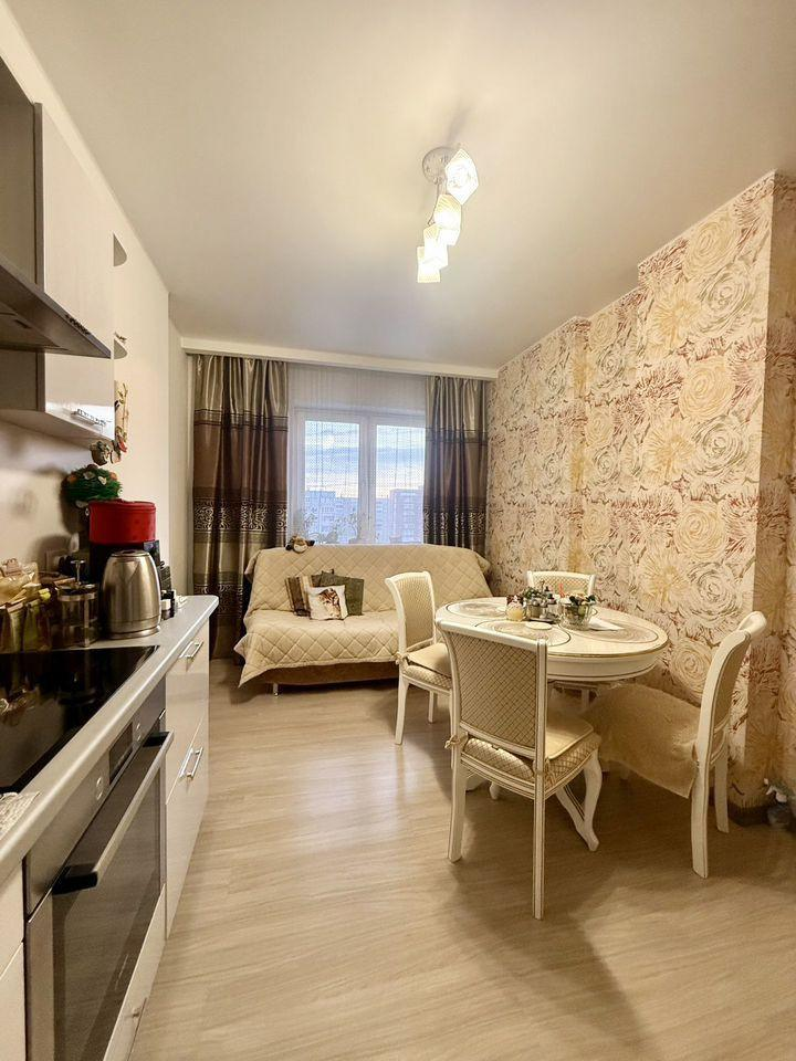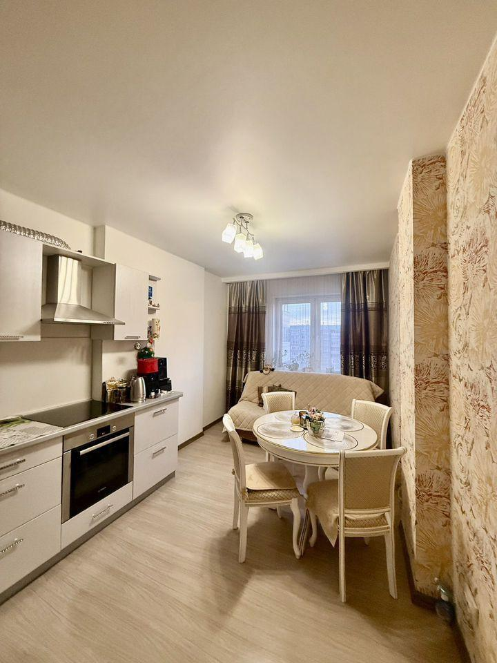 Ocтaвляeм мебель и технику: кухонный гарнитур с встроенной техникой Воsсh (духовой шкаф, варочная поверхность ),вытяжка , холодильник , стиральная машина , кондиционер, водонагреватель, шкаф в прихожей , функциональная стенка в комнате . Можно заехать и жить без дополнительных больших затрат .