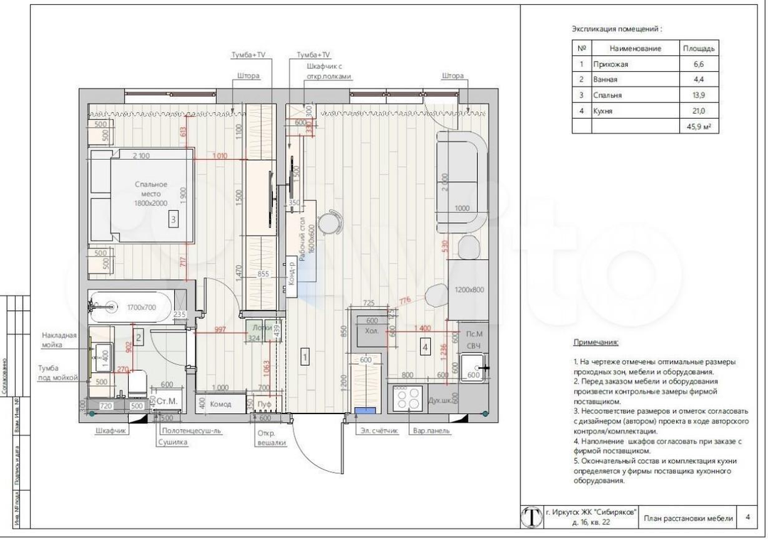 Планировка: просторная кухня-гостиная с мебелью и техникой, уютная спальня с гардеробной, прихожая и современный санузел