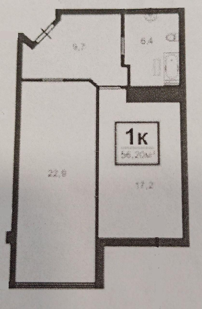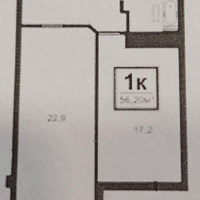 Площадь квартиры 56,2 кв. м. Площадь кухни 17,2 кв. м., комната 22,9 кв. м., санузел 6,4 кв. м., с прекрасным видом на горы и во двор.