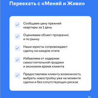 Переезд без стресса с программой «Меняй и Живи» от Самолёта Плюс , узнайте цену квартиры за 24 часа и переезжайте в новостройку без рисков. Устали ждать, торговаться и бояться ошибок при продаже квартиры? Мы берем все риски и бумажную работу на себя. Наша задача: быстро, прозрачно и максимально выгодно перевести вас из старого жилья в новое.
