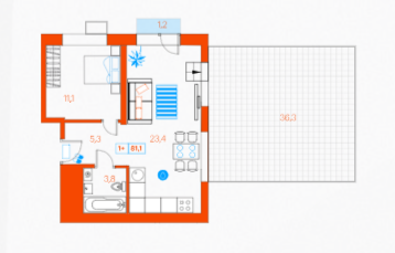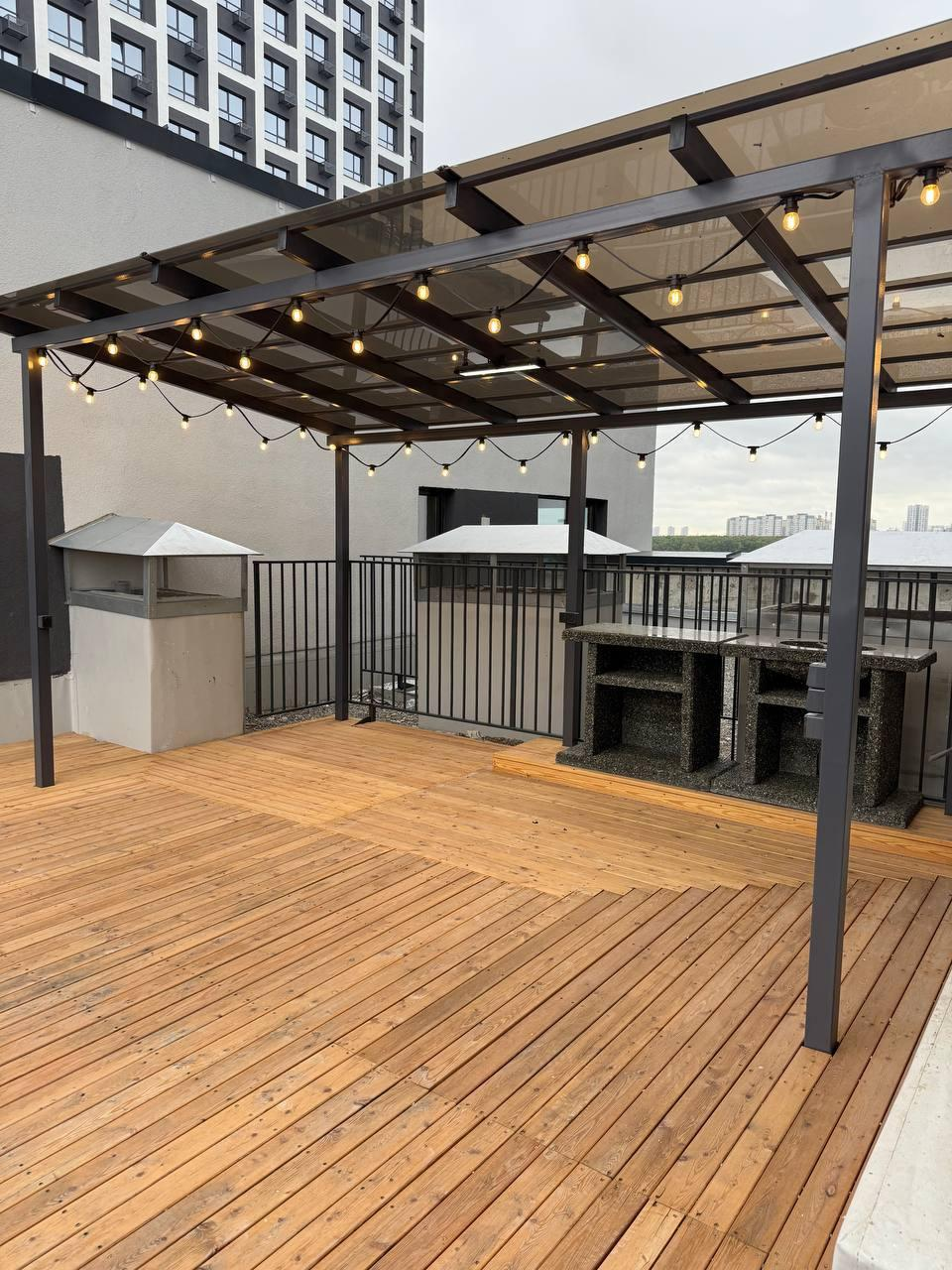 Общая площадь: 81 м².Терраса: 36,3 м² с навесом — комфортно в любую погоду.Планировка: Евроформат с кухней-гостиной и зоной спальни.Высота потолков: 3,10 метра.
