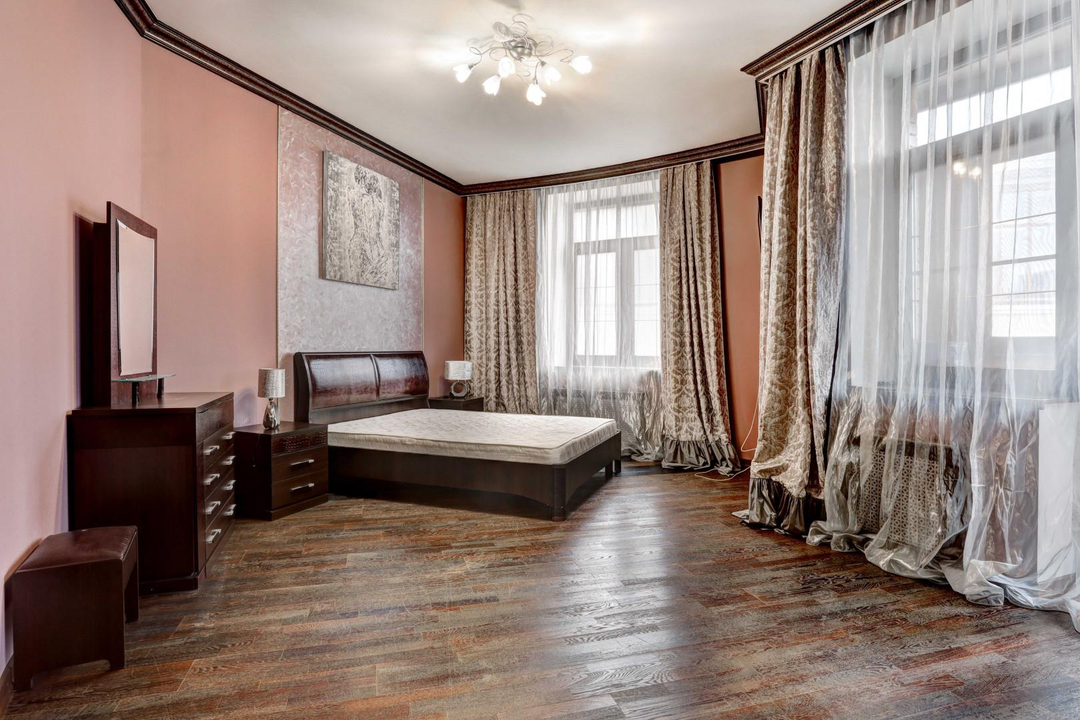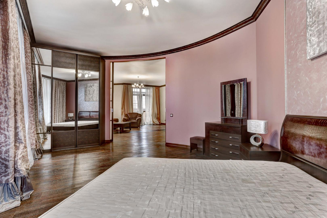 Спальня (25 м2) отделена раздвижными перегородками гостиной и есть выход на лоджию.