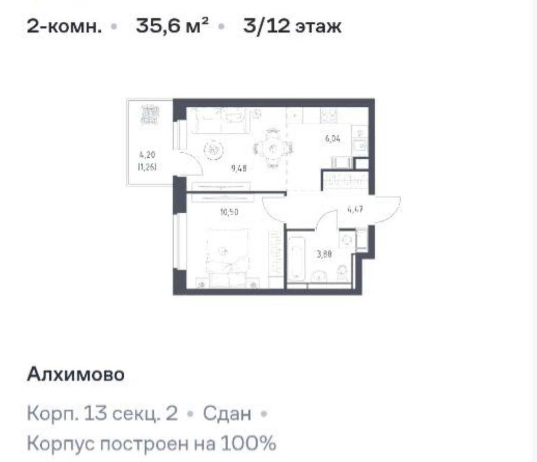 Основные характеристики:общая площадь: 35,6 м2; ( комнаты 10,5+9,48 кв.м., кухня 6 кв.м.)кладовка: 4,8 м2 (включена в стоимость);этаж: 3‑й из 12;секция: 2‑я;отделка: чистовая;особенности: лоджия, большая кухня‑гостиная, кухонный гарнитур «Мария»;вид из окон: во двор.