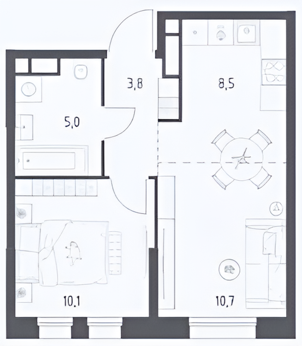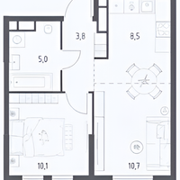 Планировка:Комната: 10,1 м²Гостиная: 10,7 м²Кухня: 8,5 м²Санузел: 5,0 м²Прихожая: 3,8 м²
