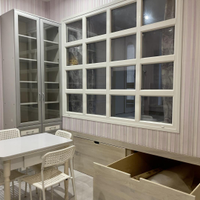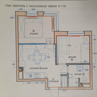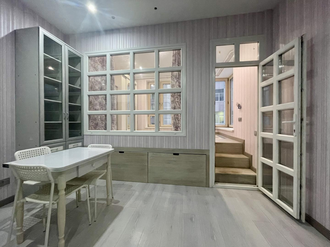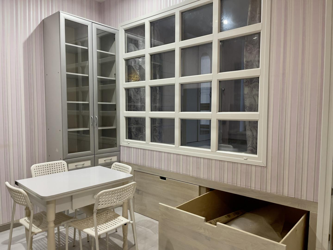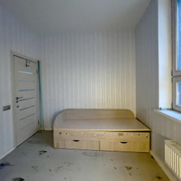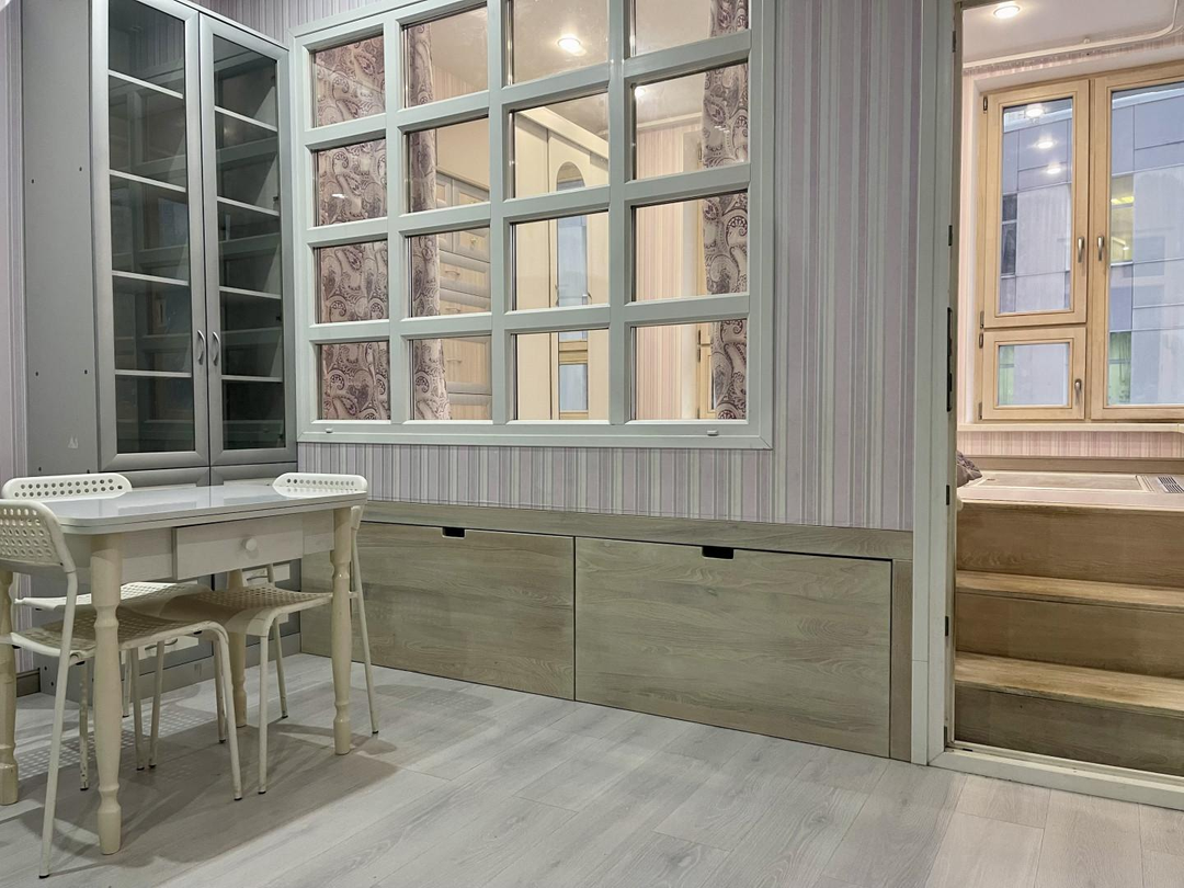 В квартире выполнен дизайнерский ремонт, делали для себя. Отдельная спальня для взрослых, детская и кухня-гостиная. Высокие потолки 3 м позволили организовать спальню на подиуме, в котором разместились места хранения вещей (ящики глубокие и выдвижные).