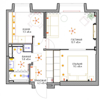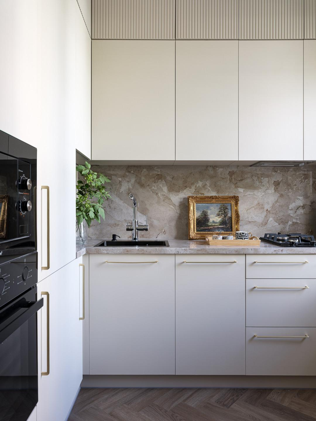 - Продуманное пространство включает в себя зону для сна, удобную гостиную и продуманную систему хранения вещей. Встроенные шкафы заменяют отдельную гардеробную, а оборудованная кухня оснащена современной бытовой техникой.