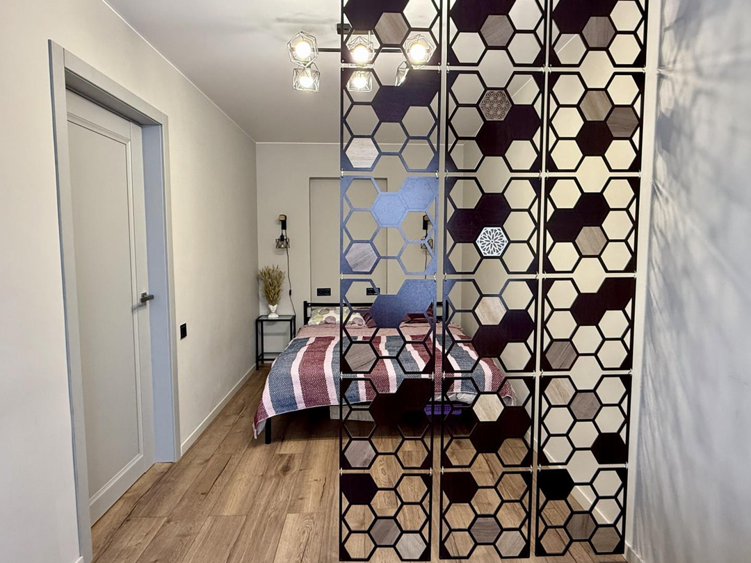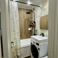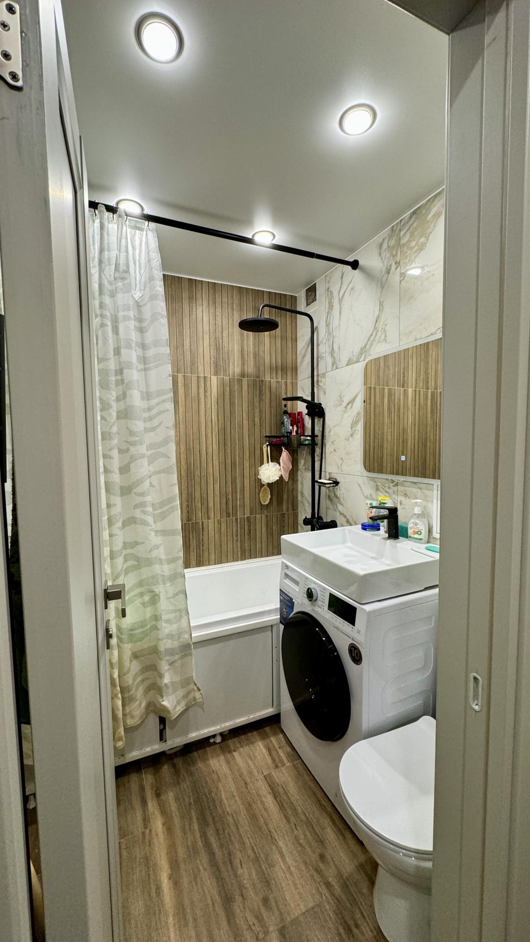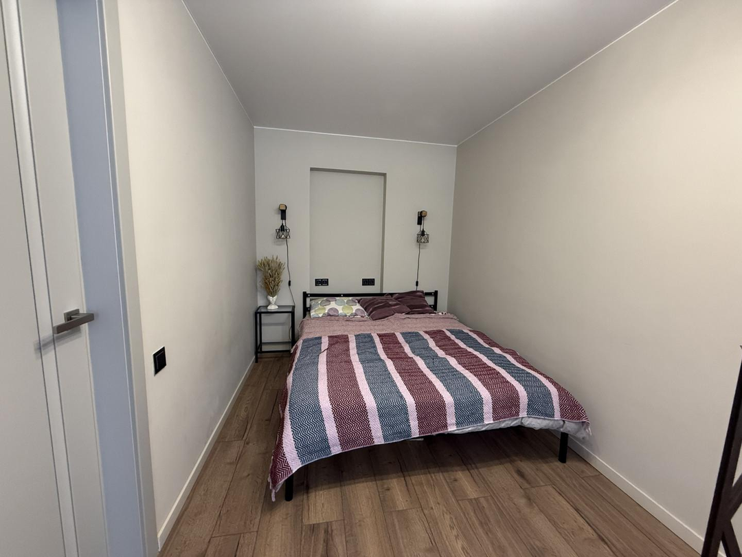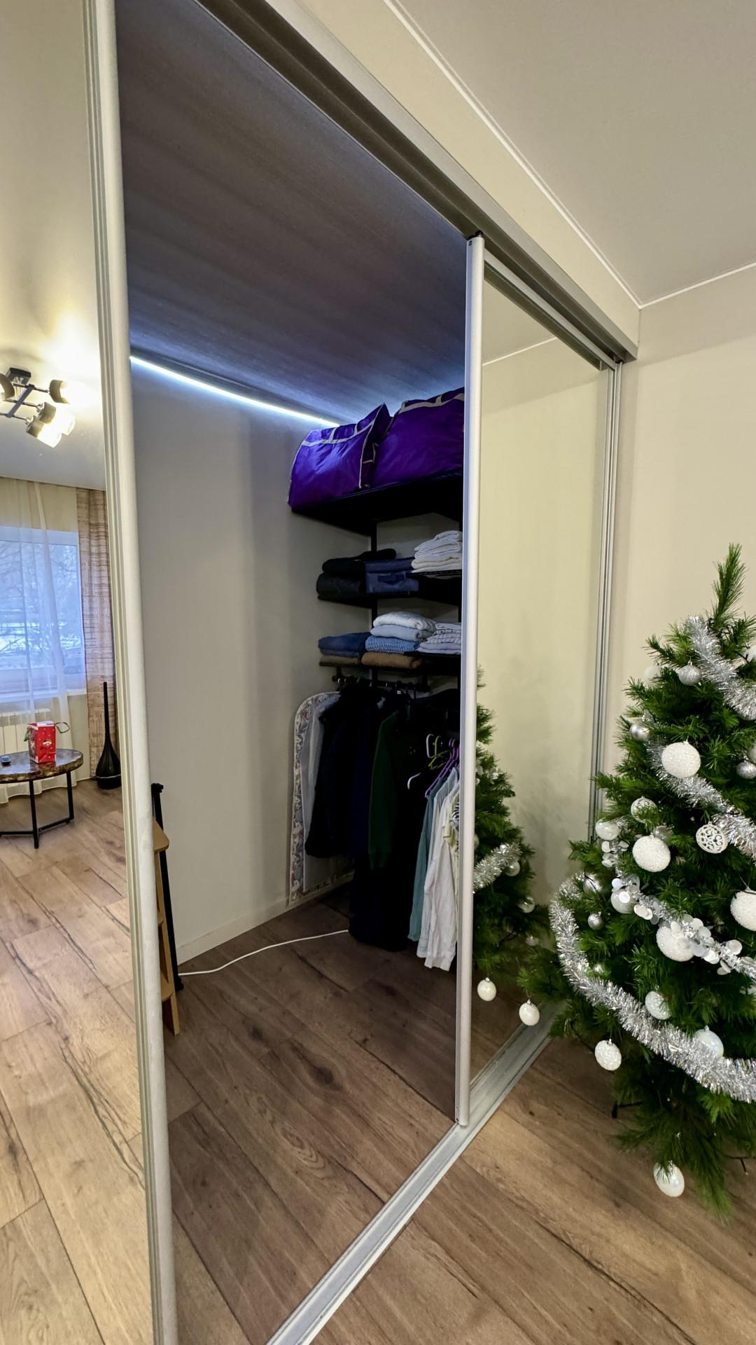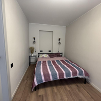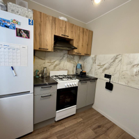 Планировка: совмещенный сан.узел ( имеется гигиенический душ, стиральная машина), кухня оборудована всем необходимым: холодильник, вытяжка, газовая духовка, просторная гостиная со встроенным огромным гардеробом с зеркалами в пол (16.6 м), спальня с выделенной рабочей зоной (12.8м).