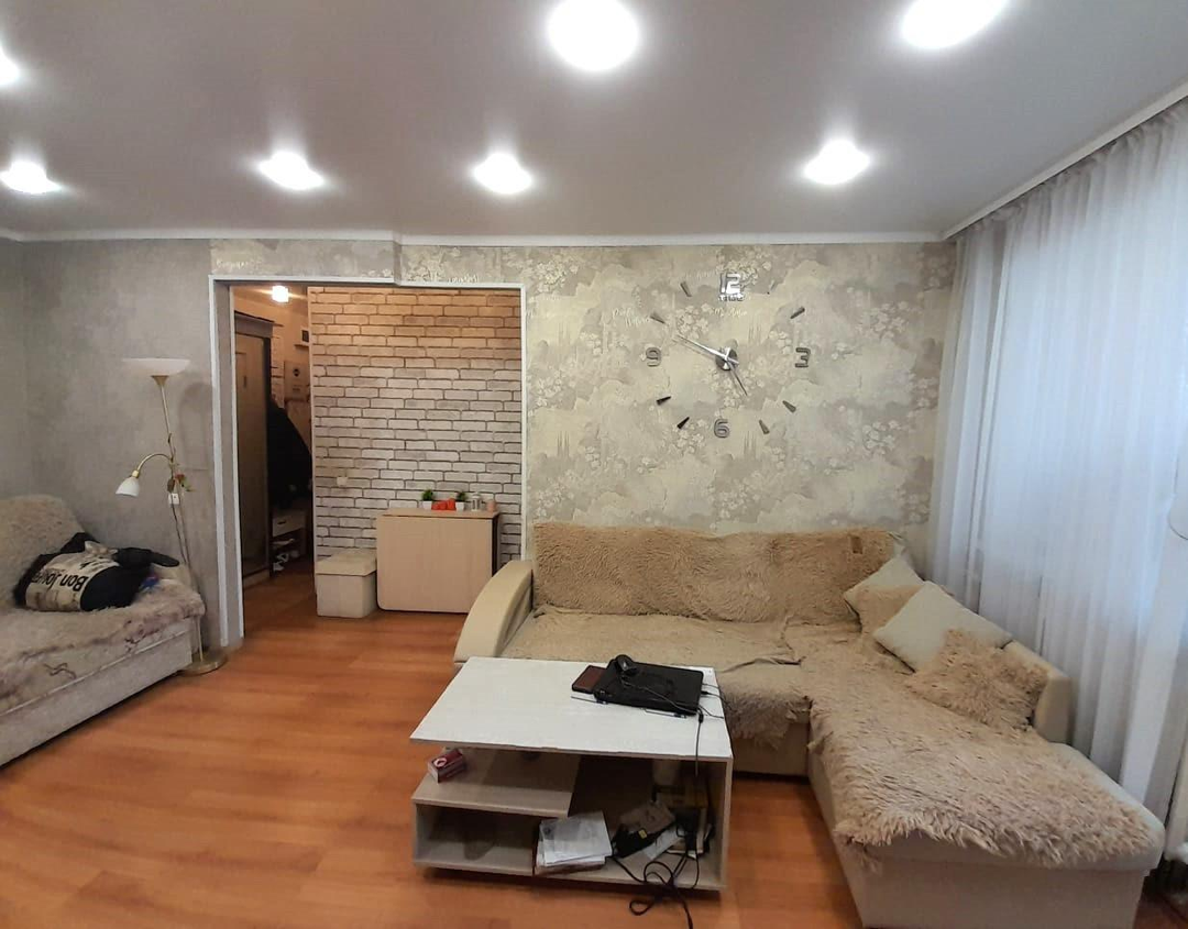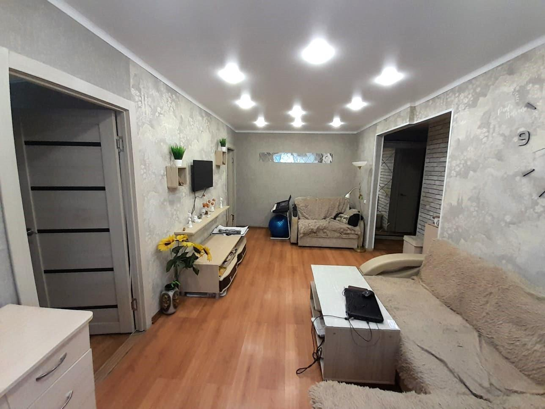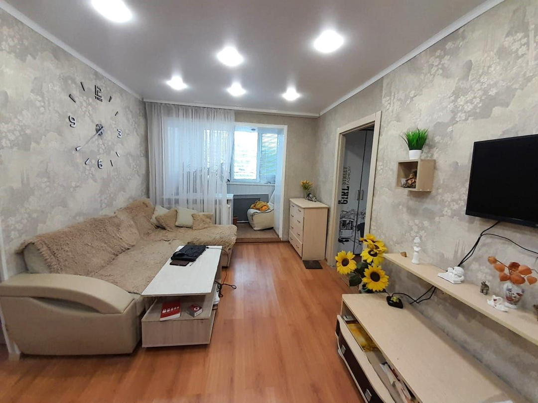 Общая площадь квартиры 43,1 кв.м.Окна ПВХ, во дворПотолки натяжныеНа полу ламинат Санузел совместный в кафельной плиткеУстановлены счетчики на свет, водуВходная дверь металлическаяБалкон утеплен и остеклен ПВХПодвал