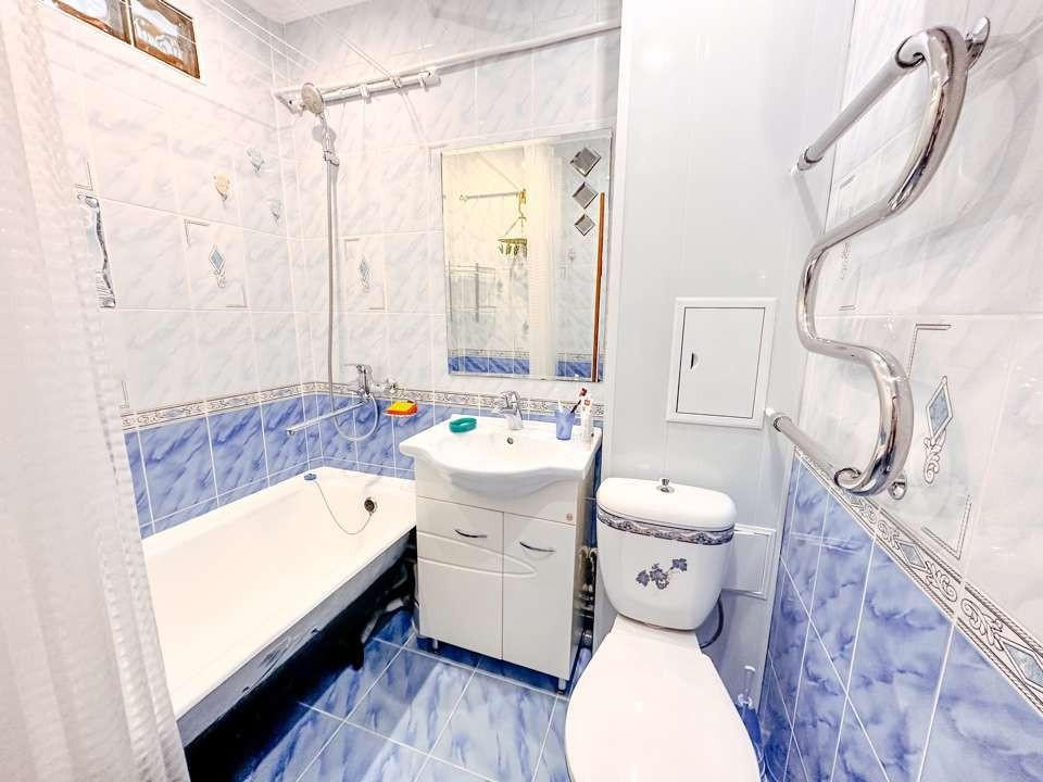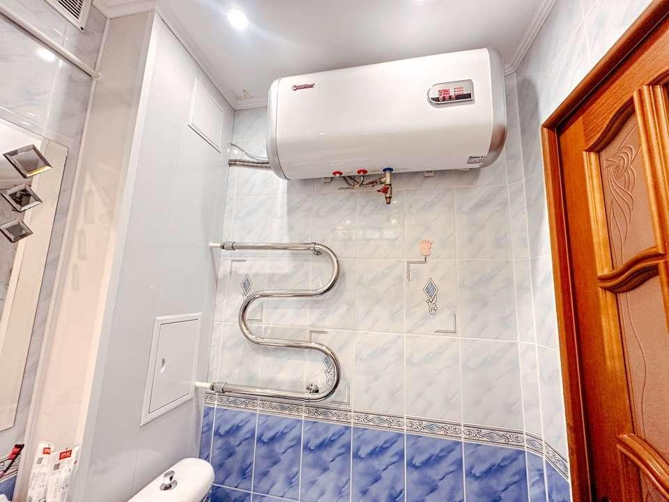 Ванная комната в кафеле. В наличии тумба с раковиной, зеркало и водонагреватель на случай гидравлических испытаний.