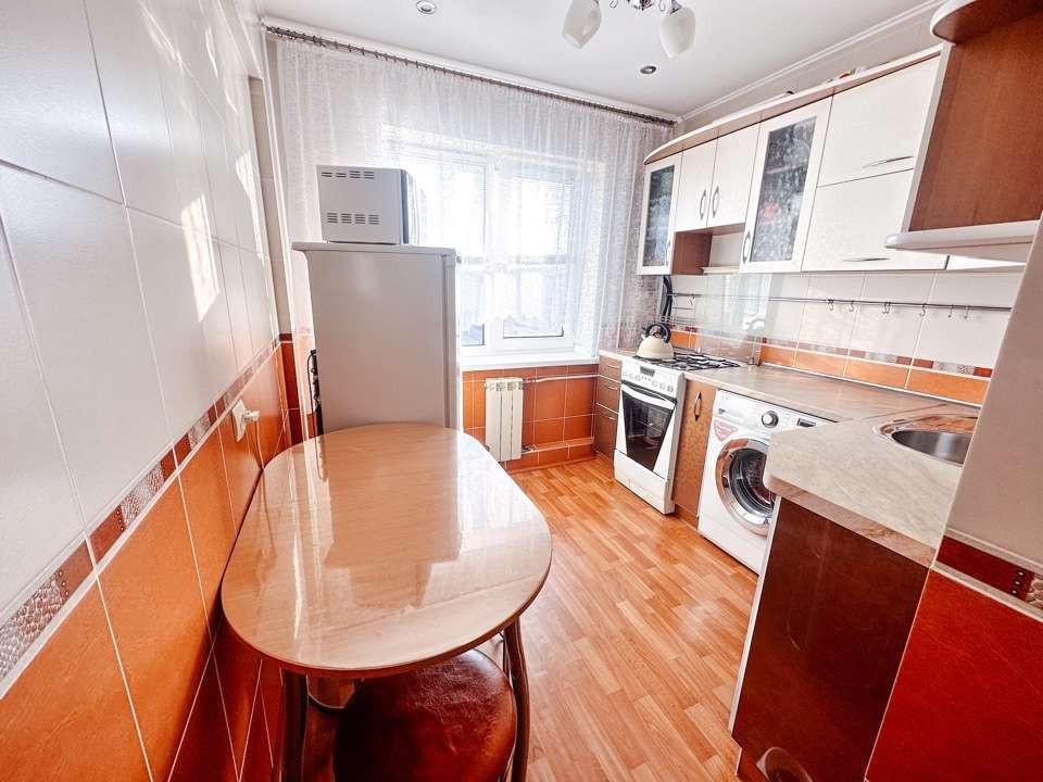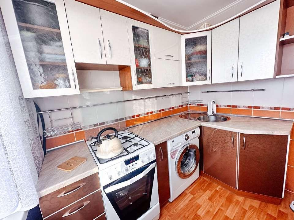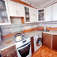 Стены кухни полностью отделаны плиткой. Остается встроенный кухонный гарнитур.