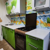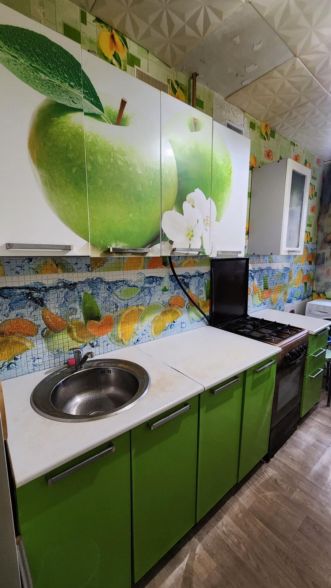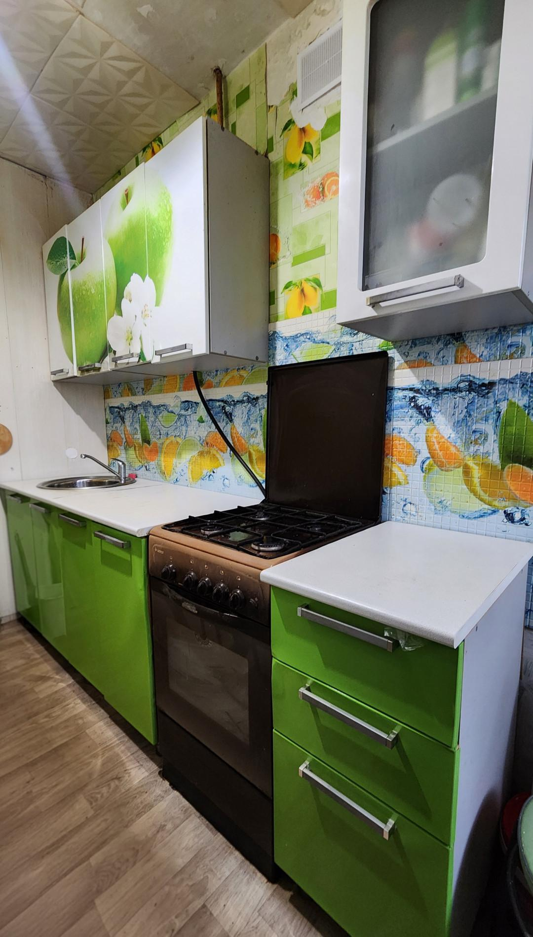 Остается кухонный гарнитур с газовой плитой, шкафы в гостиной и в спальне.