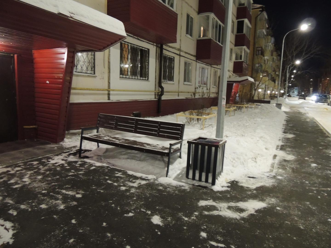 Двор: Установлены новые, современные диодные фонари освещения, лавочки, урны. Размечены парковочные места.