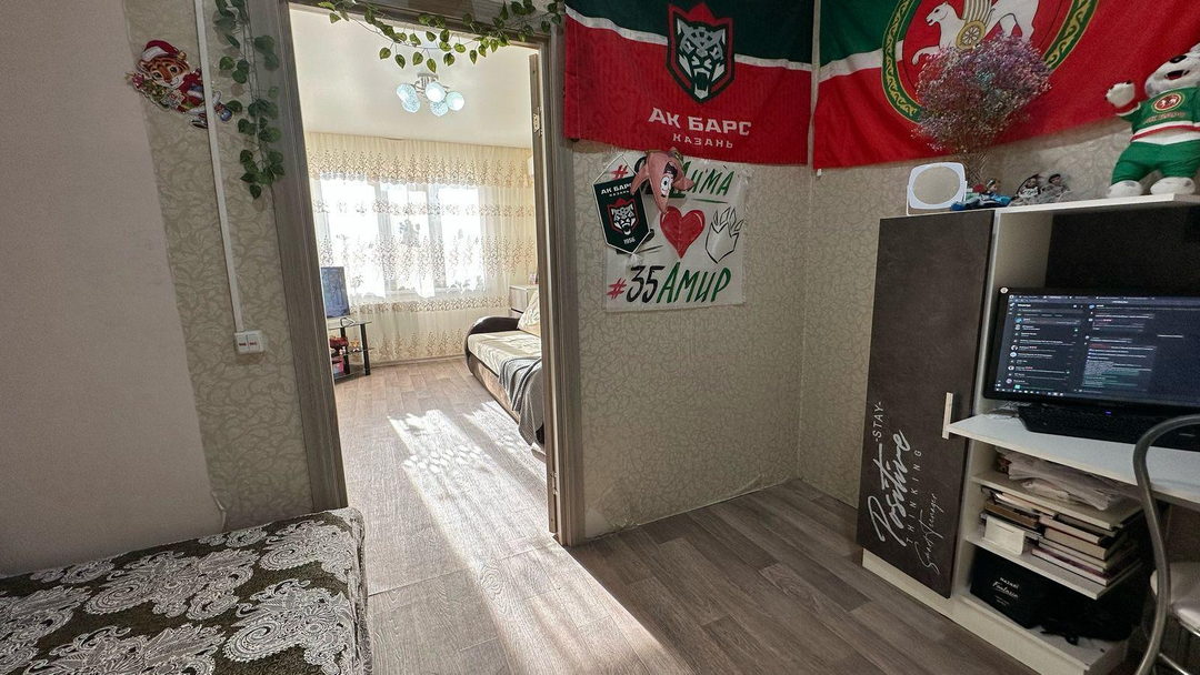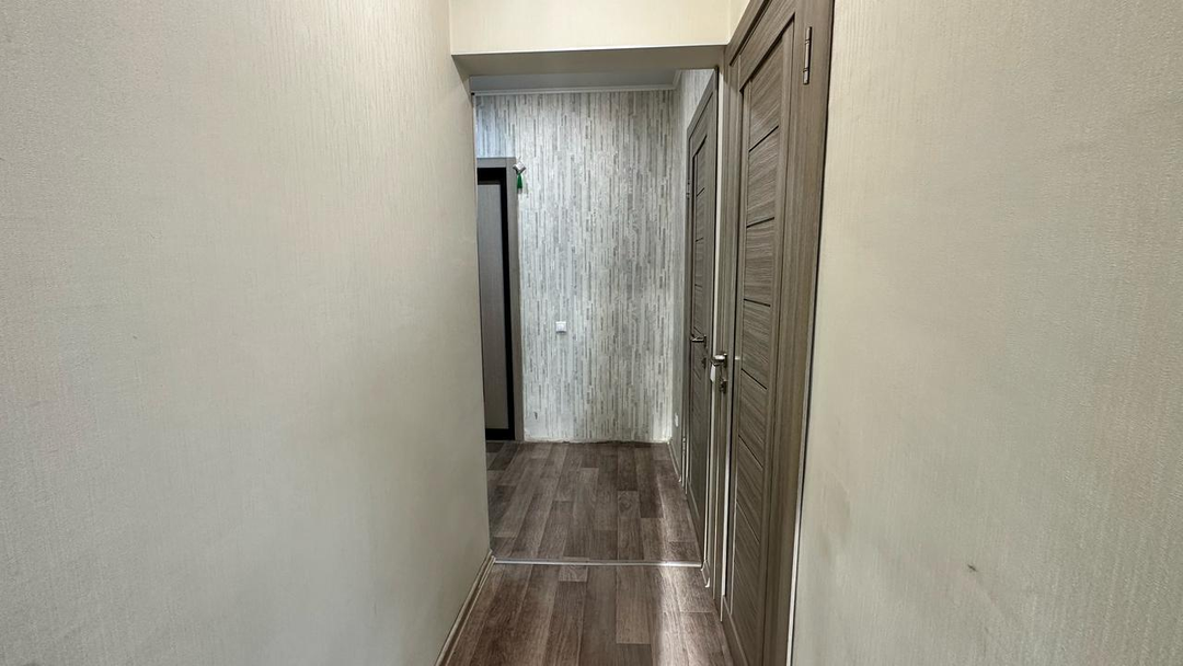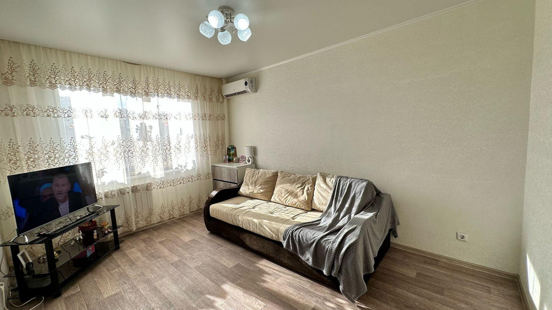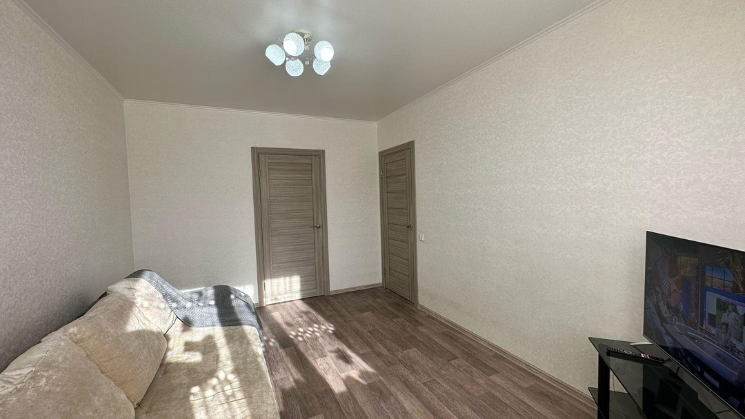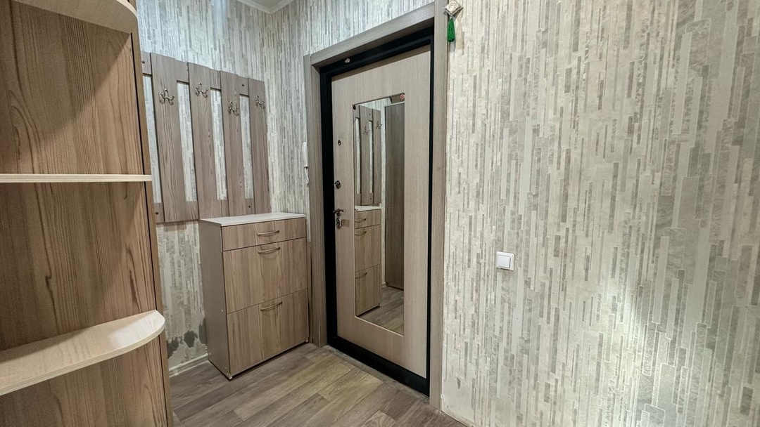 В одной из комнат остаётся диван, что значительно упрощает процесс переезда. Квартира оформлена натяжными потолками, на полу уложен линолеум, а пластиковые окна обеспечивают хорошую тепло- и звукоизоляцию. Стены оклеены обоями, создавая уютную атмосферу. Санузел отделан кафелем, что гарантирует его долговечность и лёгкость в уходе.