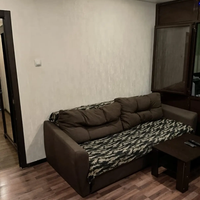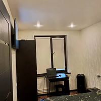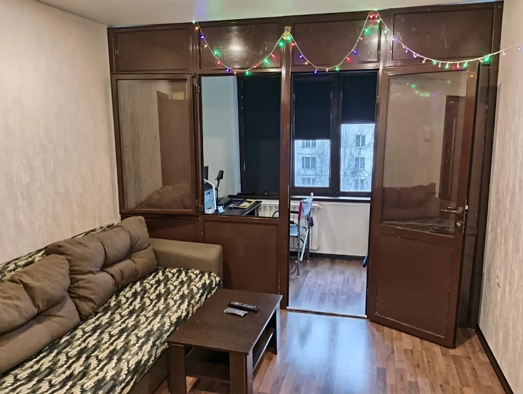 В гостиной установлен большой шкаф купе во всю стену и диван еврокнижка 160 см шириной, а также телевизор Full hd Shivaki 99см со смарт приставкой. А также из гостиной легким пластиком выделен кабинет, который мужчины обычно делают себе на балконе. Габариты кабинета 130х300см. Кабинет закрывается, в нем есть жалюзи изнутри . В кабинете есть диван-кровать 120 см шириной, аудиосистема Sven 20 Ватт, монитор Philips 58 см, МФУ цветное лазерное Brother dcp-9020cdw. Ноутбук Lenovo по договорённости.