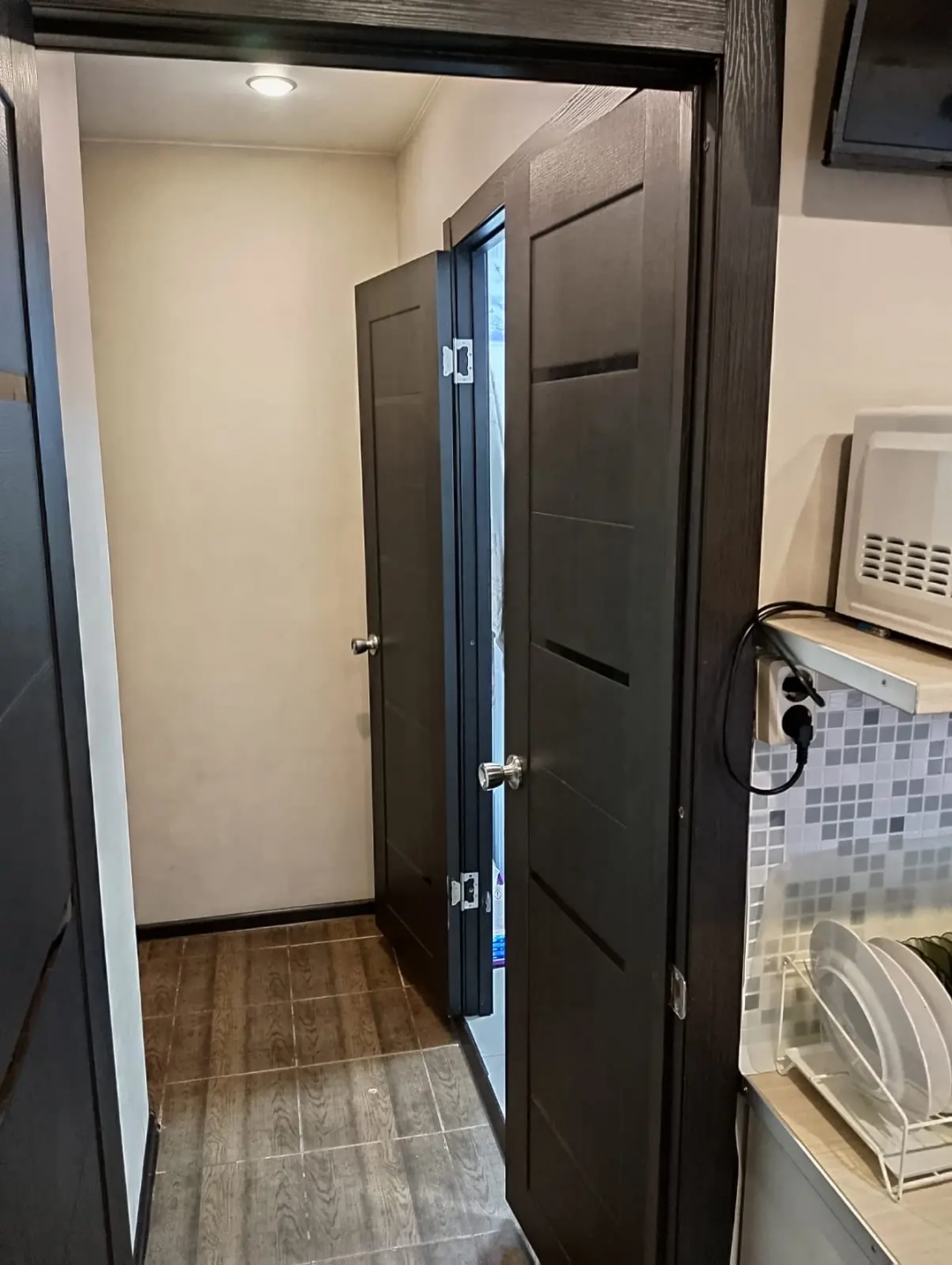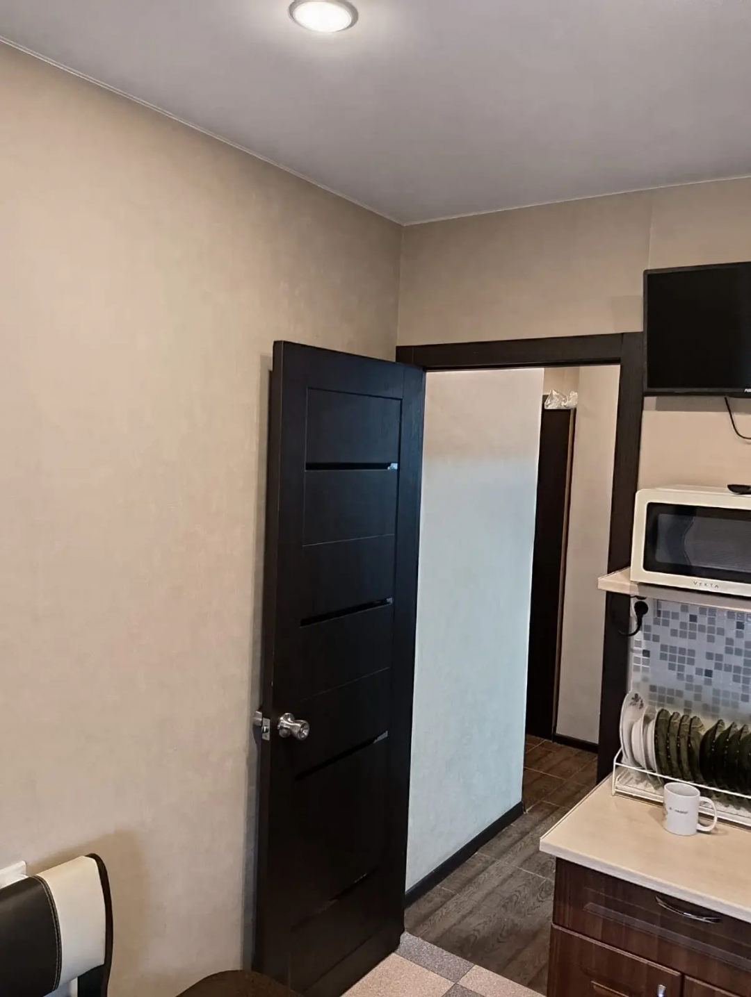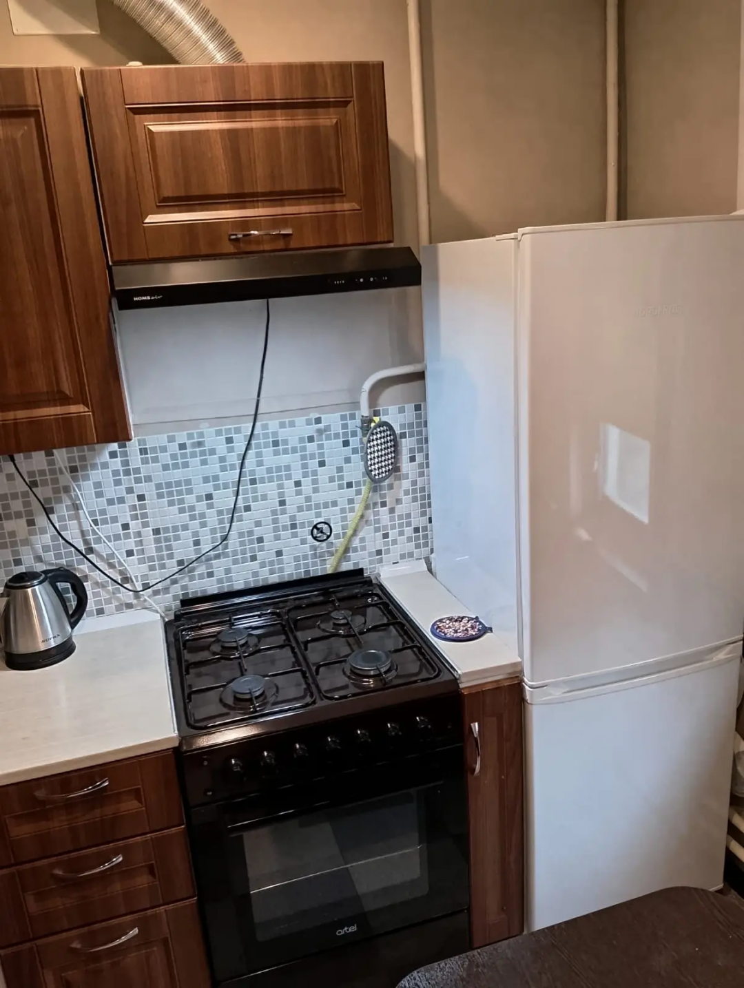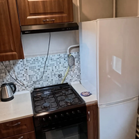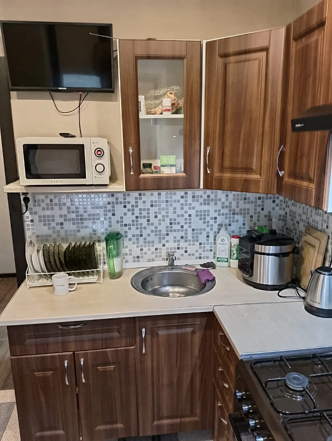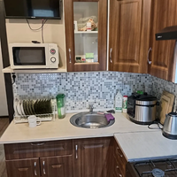 Кухня оборудована всем необходимым: газовой плитой с электро духовкой, холодильником, Smart телевизором 60см, микроволновкой, мультиваркой, блендером, колонкой Digma на 20 ватт