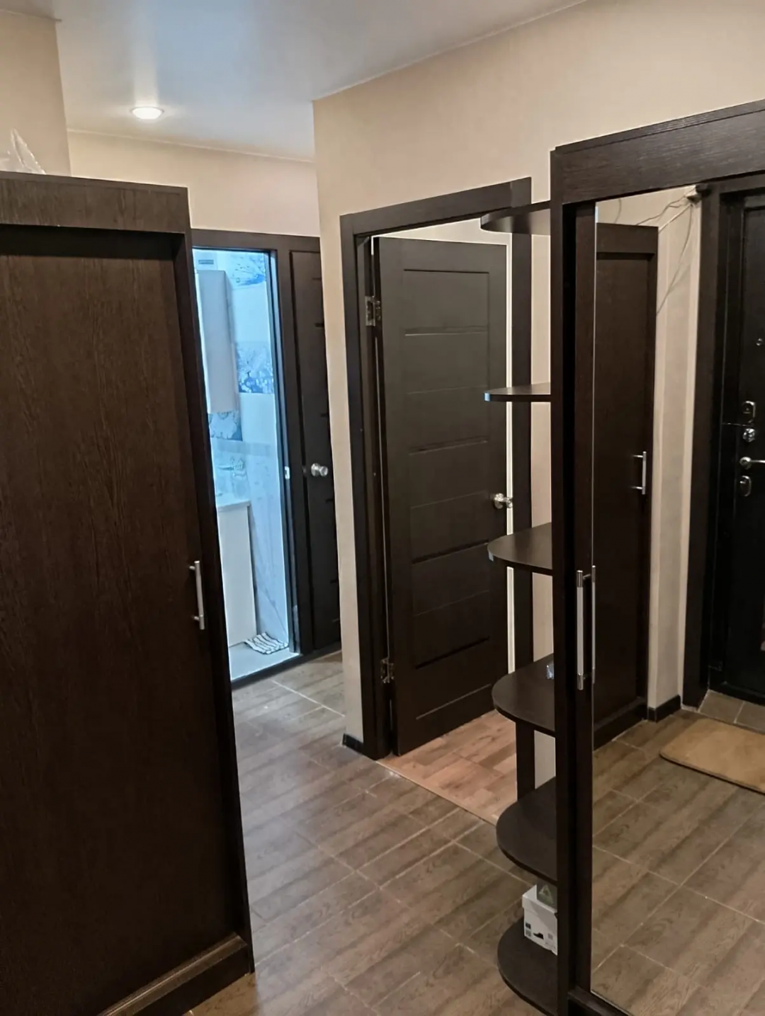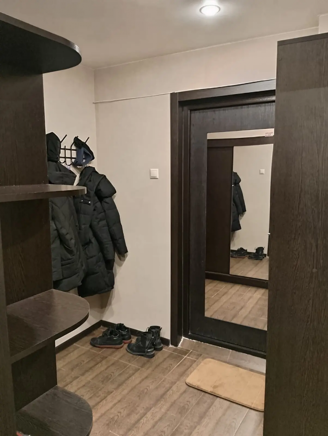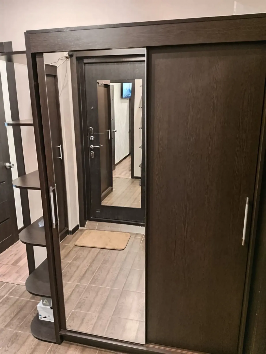 В прихожей удобные шкафы купе для хранения верхней одежды и обуви.