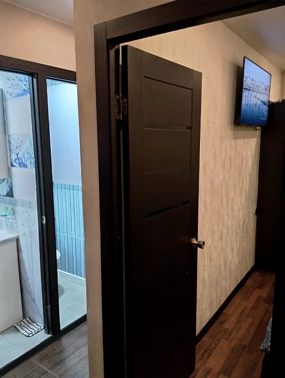 Во все комнатах блэк-аут жалюзи и замки от детей на окнах. Окна Rehau ламинированы под дерево. У всех дверей ограничители.