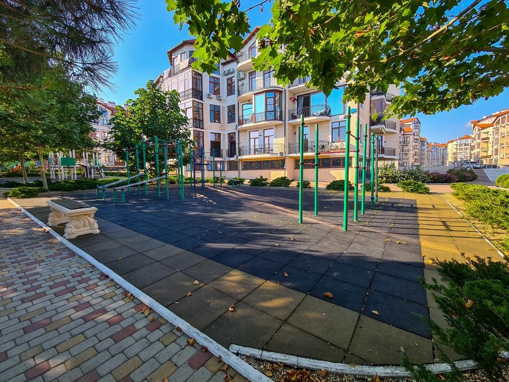 Закрытая территория жилого комплекса Черноморский 2 с большим количеством парковочных мест, детских и спортивных площадок, великолепный ландшафтный дизайн.