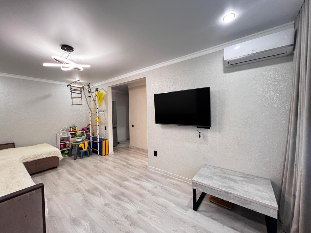 В квартире сделан ремонт, полностью заменена проводка, пол выровнен и застелен ламинатом, все оконные блоки заменены, в ванной, туалете и на кухне заменены коммуникации, санузел в плитке, входная и межкомнатные двери хорошего качества с шумоподавлением. Установлена встроенная кухня с техникой: варочная панель, духовой шкаф, посудомойка, вытяжка, кондиционер (сплит-система) - все остается. Мебель и остальная техника под запрос.