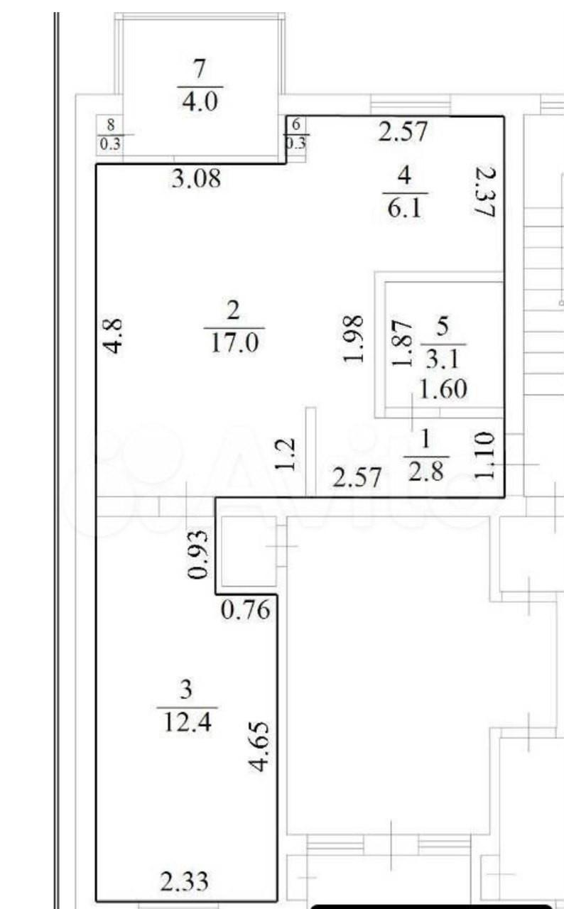 Квартира общей площадью 45 кв. м., комната 12,4 кв. м., кухня - гостиная 27 кв. м., прихожая 2,8 кв. м., сан. узел совмещенный 3.1 кв. м., окна выходят на улицу и во двор.