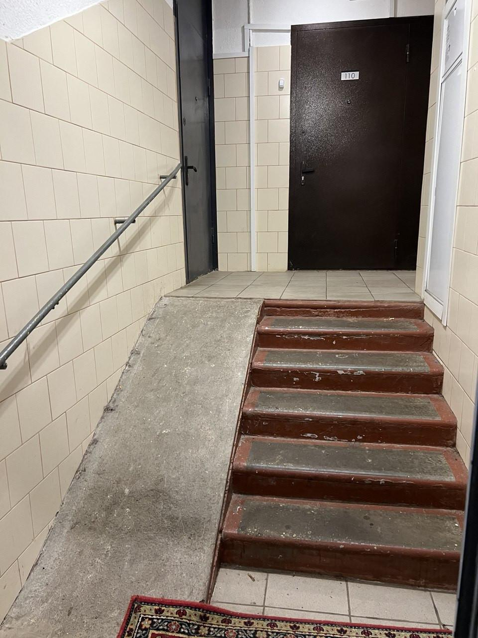 Дом в хорошем состоянии, подъезд отремонтирован, оборудован пассажирским лифтом и мусоропроводом, что делает проживание более удобным. В подъезде есть пандус для колясок.