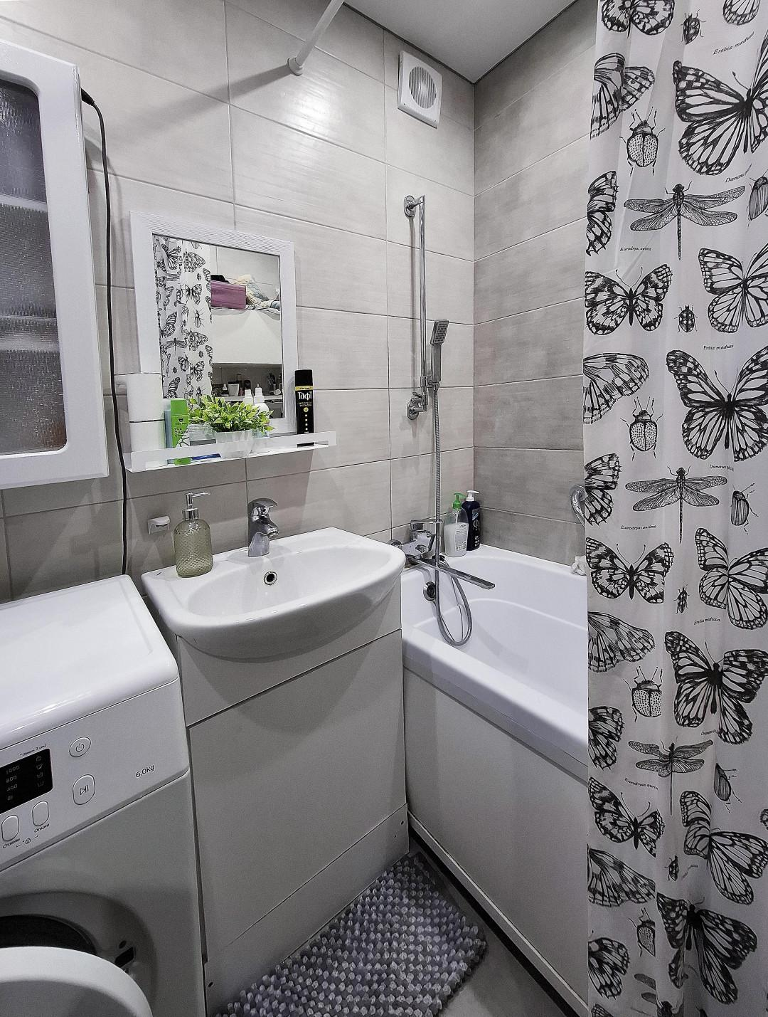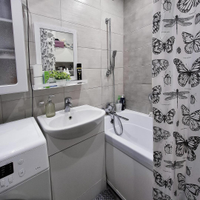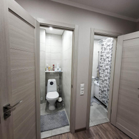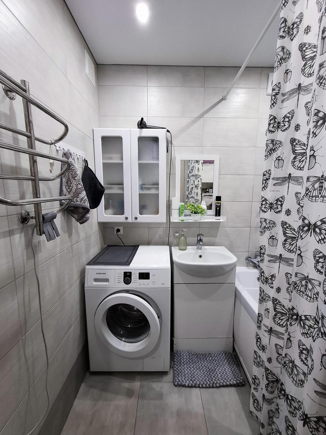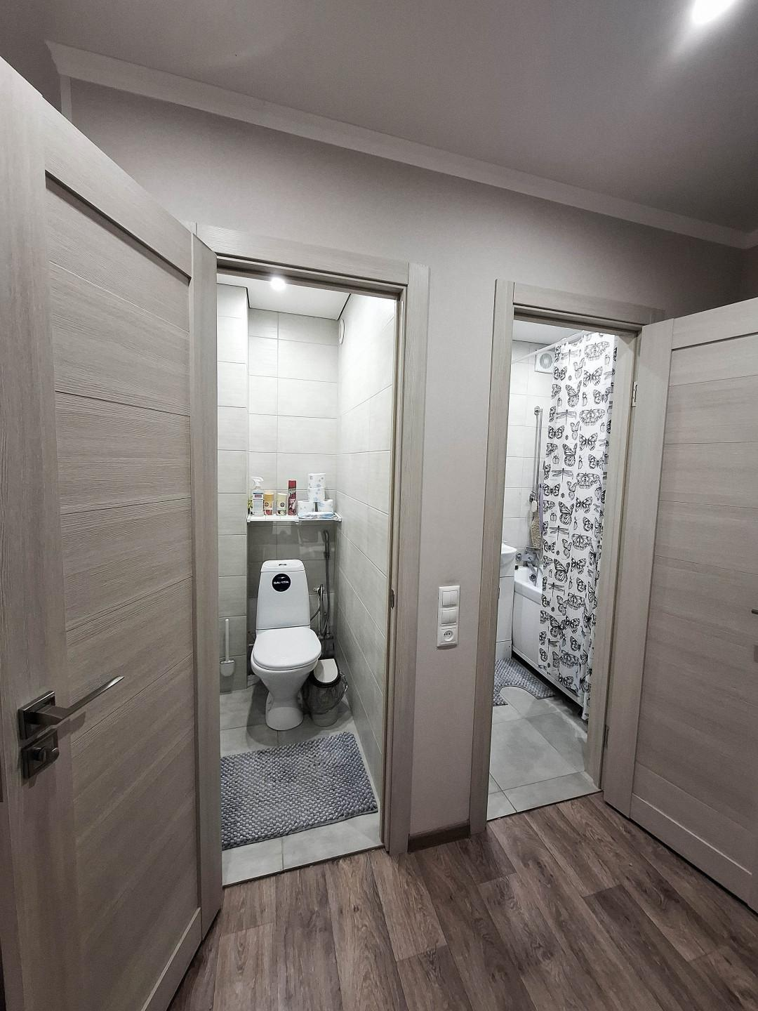 Особое внимание уделено санузлу: установлен тёплый пол, качественная современная плитка. Отделка стен выполнена в светлых, спокойных тонах, позволяющих удачно сочетать любую мебель.
