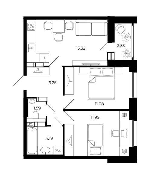 • Площадь балконов 2,3 м²
