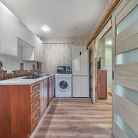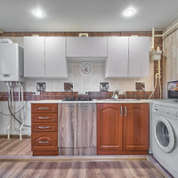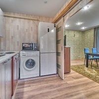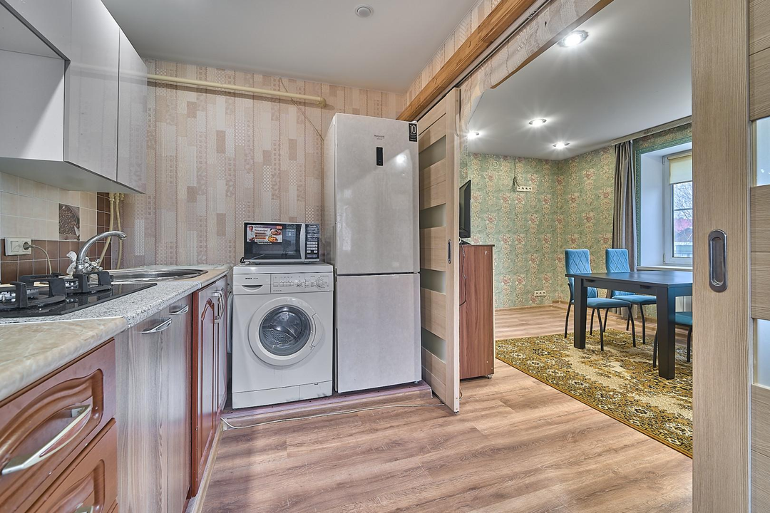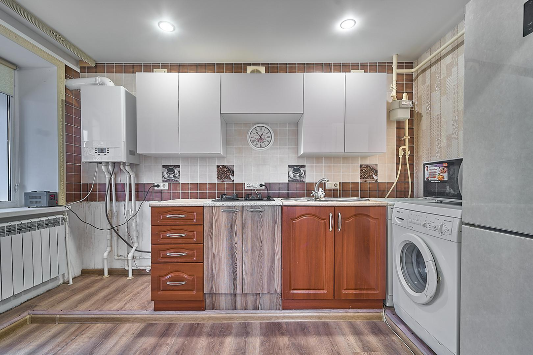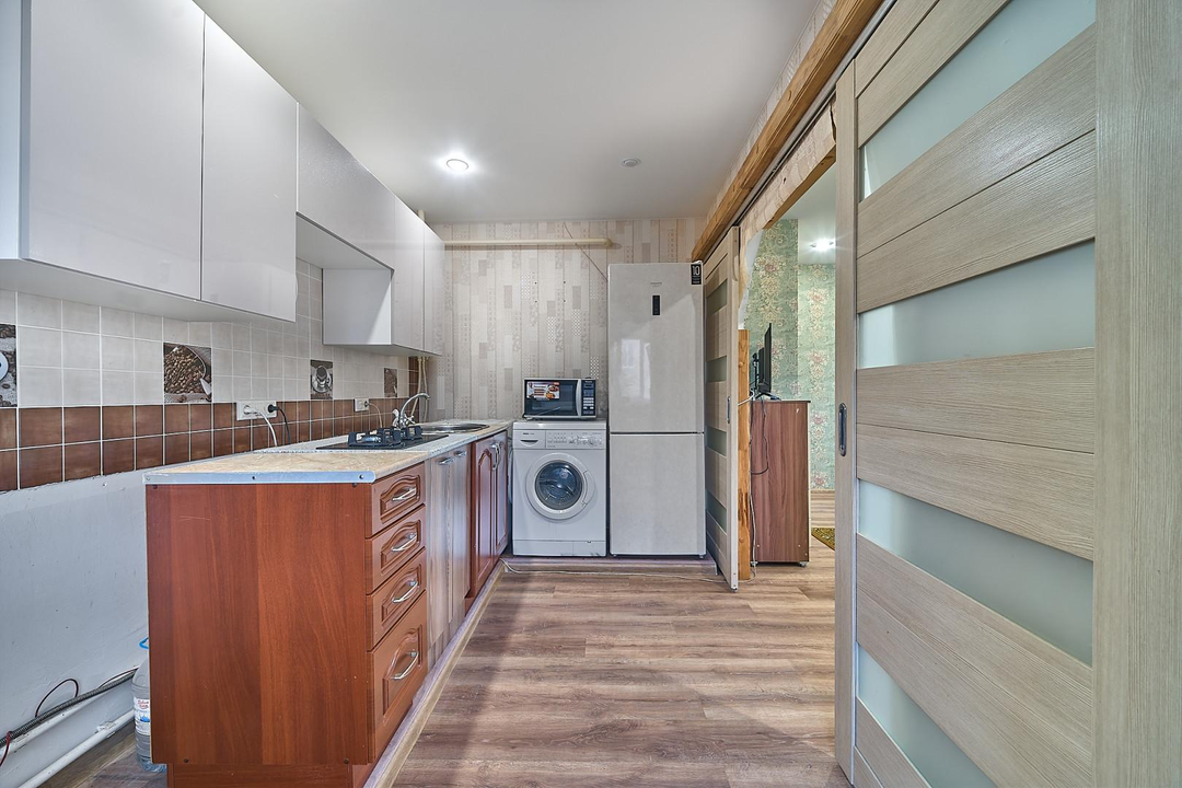 Остается: кухонный гарнитур, стиральная машинка и тумба в прихожей.