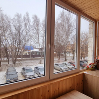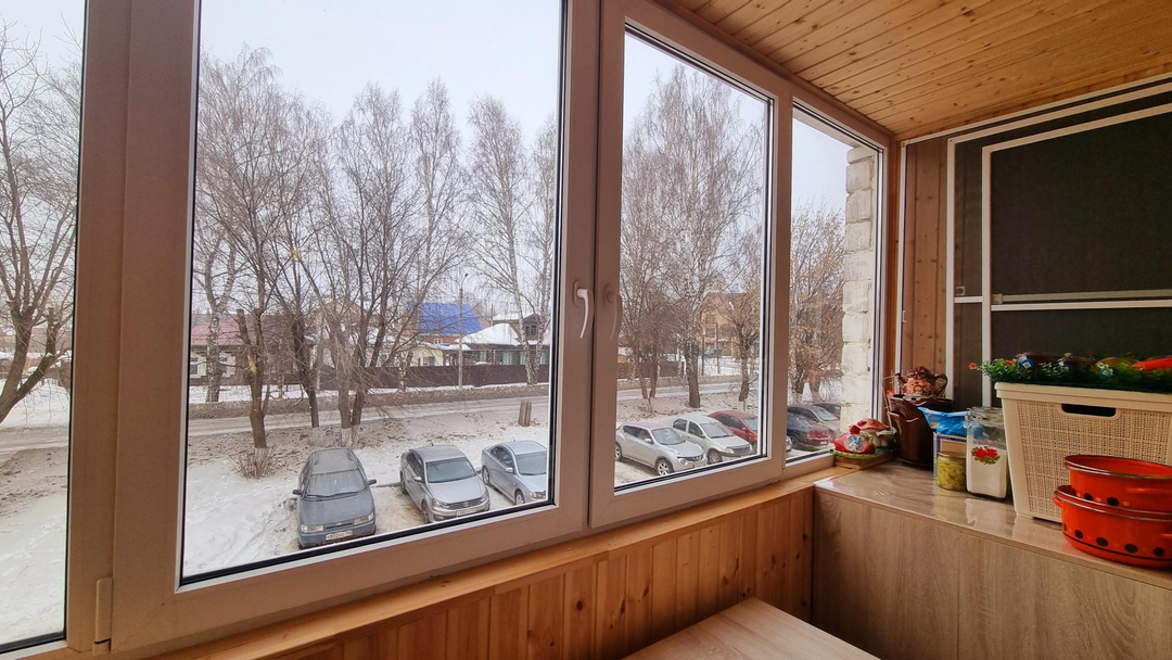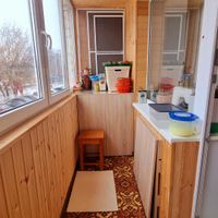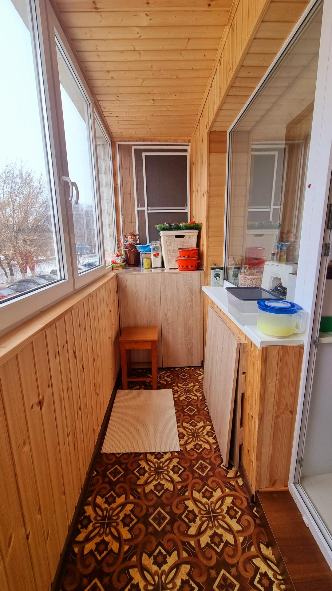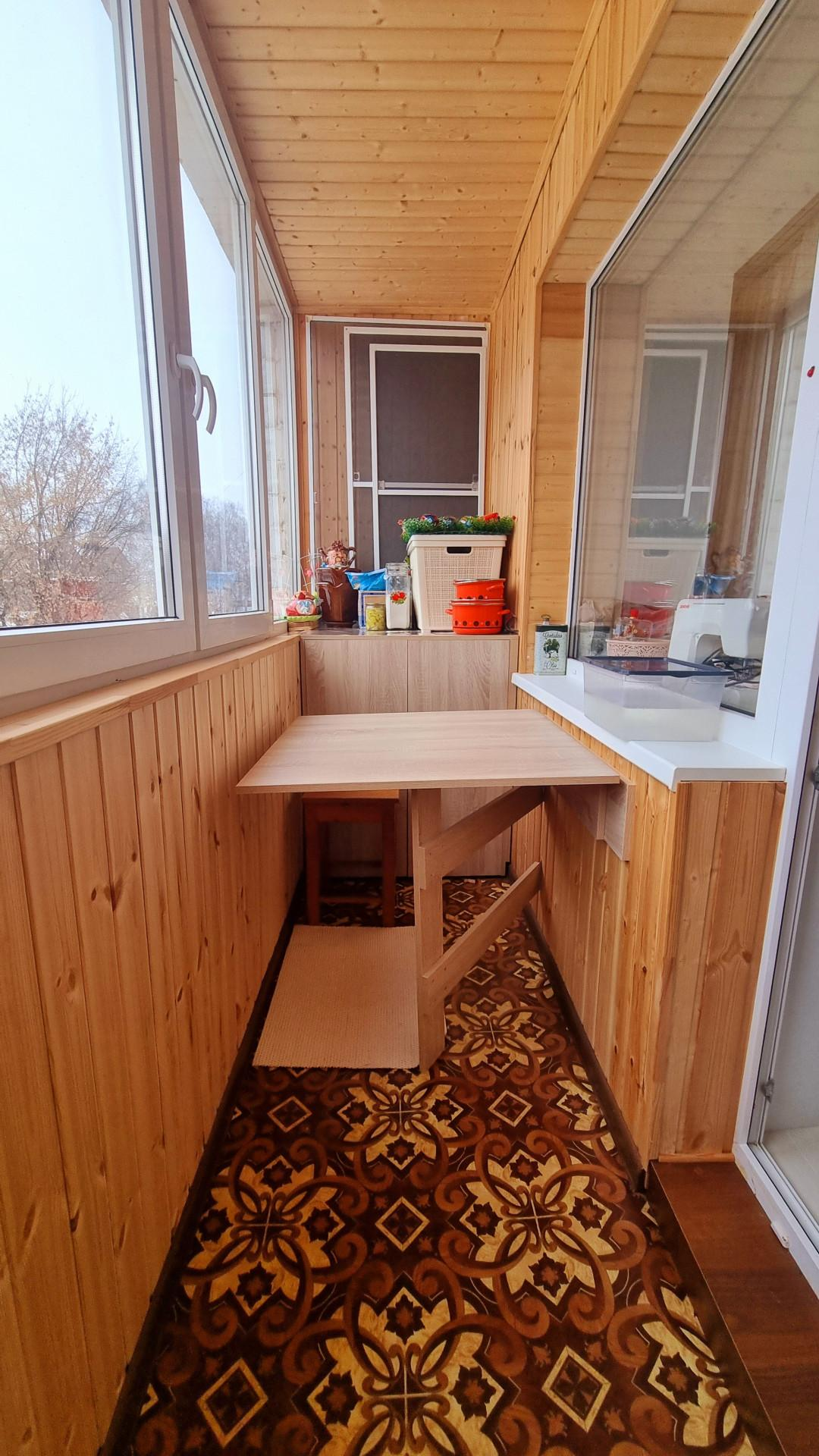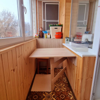 Балкон обшит вагонкой и оборудован складным столиком.
