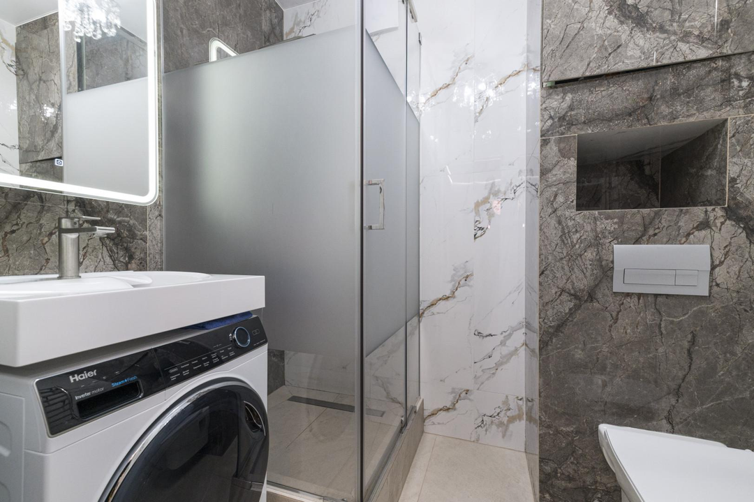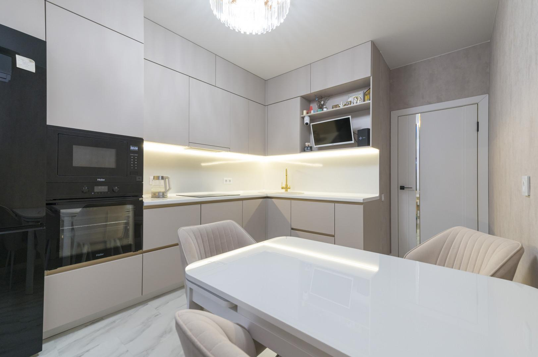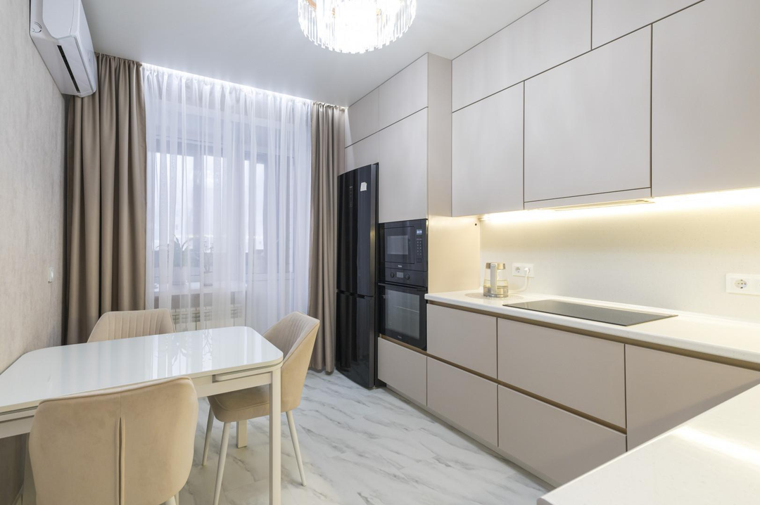 Практически вся мебель и техника остается новым владельцам:встроенная кухня с бытовой техникой (посудомоечная машинка, встроенный духовой шкаф и микроволновая печь, варочная панель, вытяжка, холодильник, кондиционер)встроенный шкаф-купе в прихожей;стиральная машинка;водонагреватель на случай отключения горячей воды;встроенные шкафы в детской и т.п.