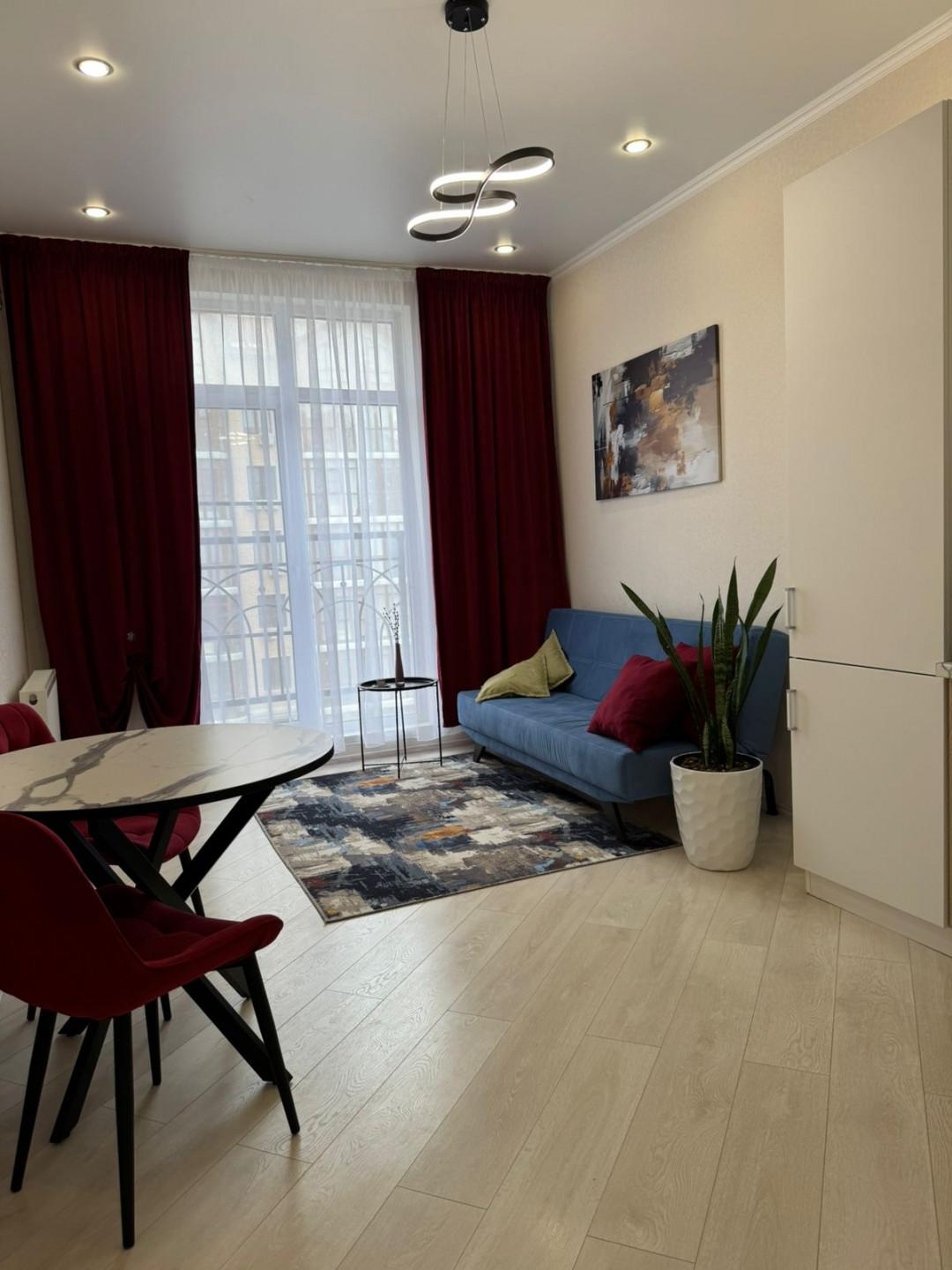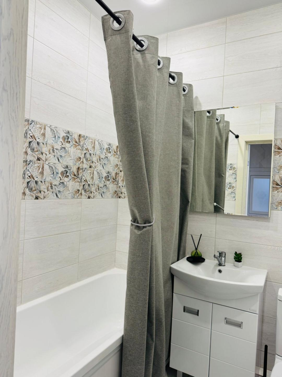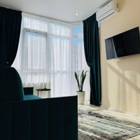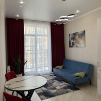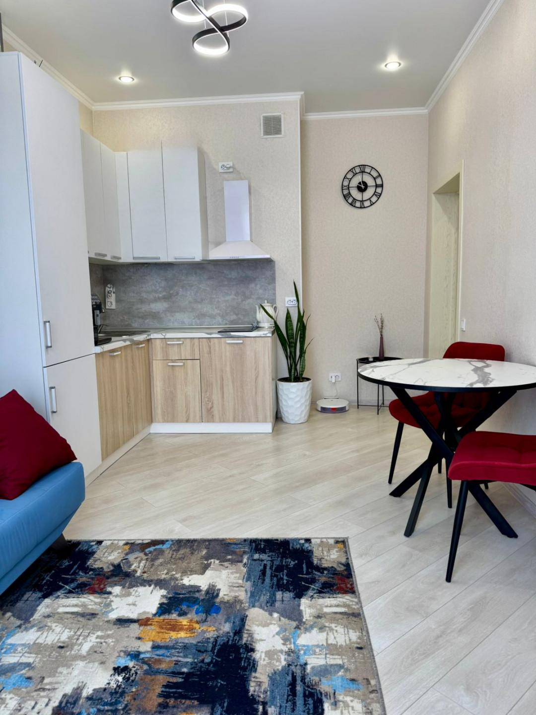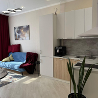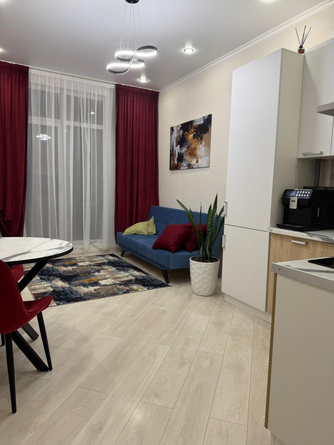 Квартира имеет евроремонт, выполненный из качественных материалов. В комнате установлен кондиционер, что позволяет поддерживать комфортную температуру в любое время года. На кухне установлена современная техника, включая холодильник, вытяжку и плиту. Ванная комната оборудована ванной и стиральной машиной.