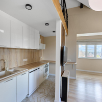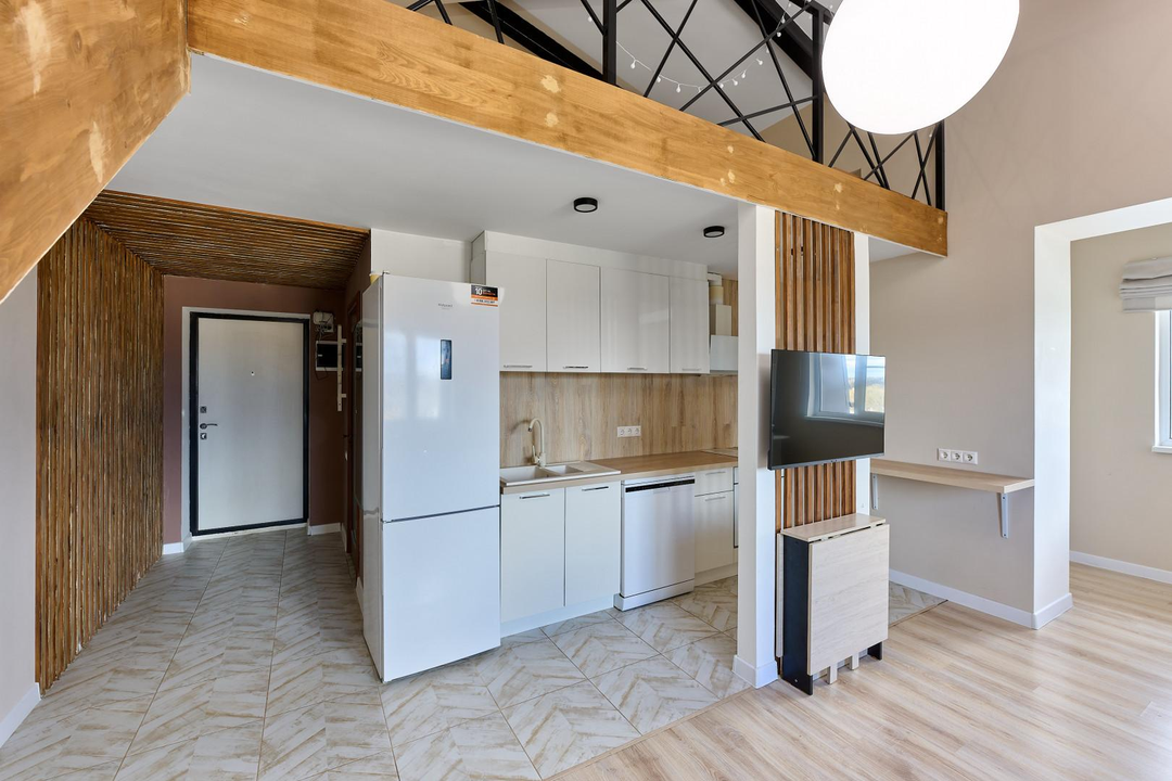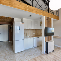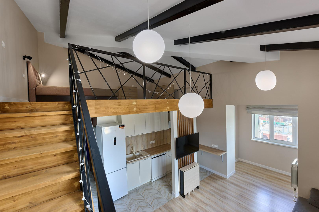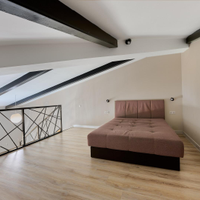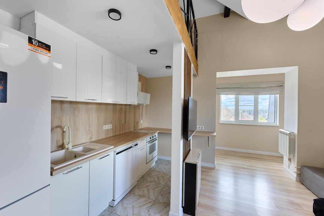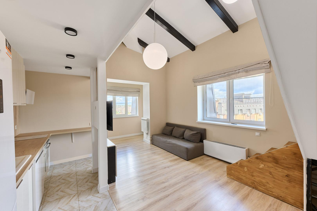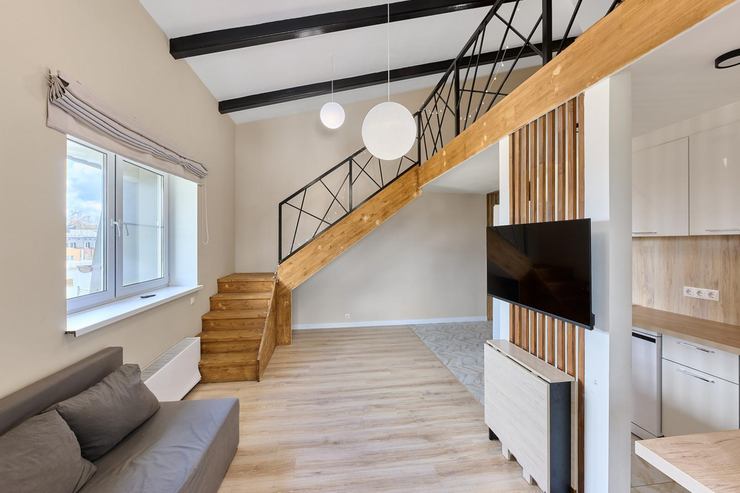 одна изолированная комната, вторая — приватная, на втором этаже, создающая атмосферу загородного дома. Квартира наполнена естественным светом. Полностью готова к проживанию: остается вся необходимая мебель — кухня с гарнитуром, диван и шкаф на первом этаже, а также кровать и два комода на втором. Для вашего уюта предусмотрены теплые полы и современный холодильник. Стильная ванная комната оснащена новой, современной сантехникой.