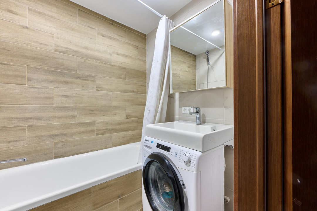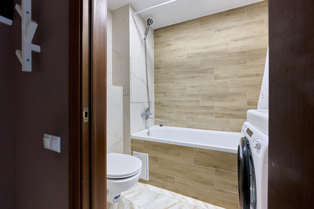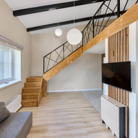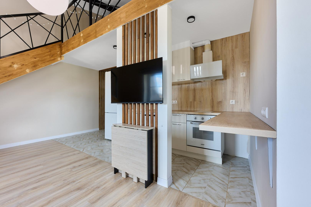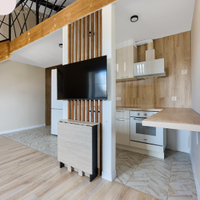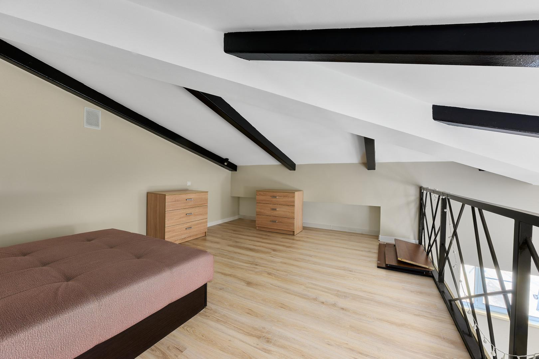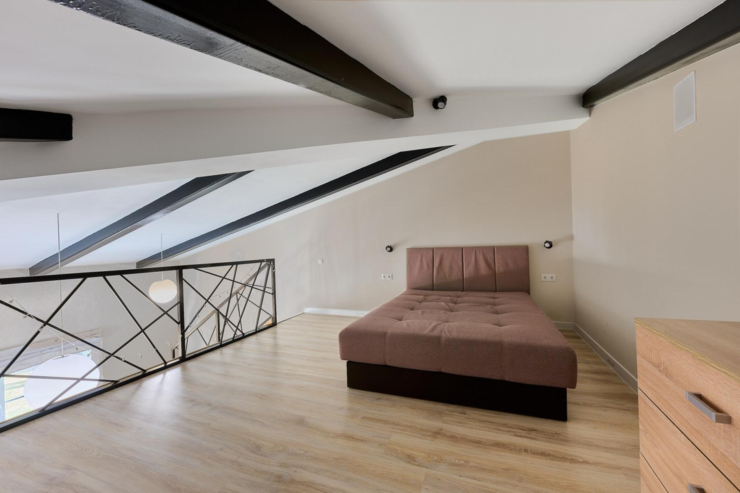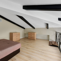 одна изолированная комната, вторая — приватная, на втором этаже, создающая атмосферу загородного дома. Квартира наполнена естественным светом. Полностью готова к проживанию: остается вся необходимая мебель — кухня с гарнитуром, диван и шкаф на первом этаже, а также кровать и два комода на втором. Для вашего уюта предусмотрены теплые полы и современный холодильник. Стильная ванная комната оснащена новой, современной сантехникой.