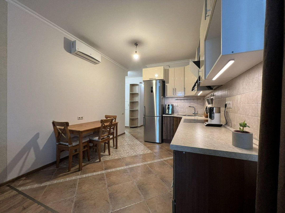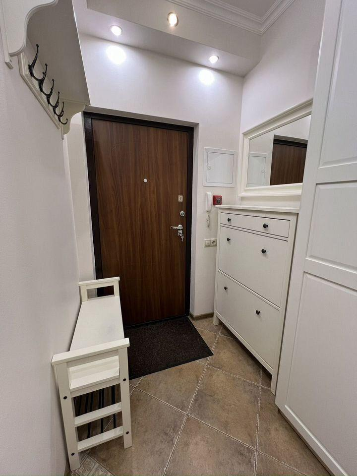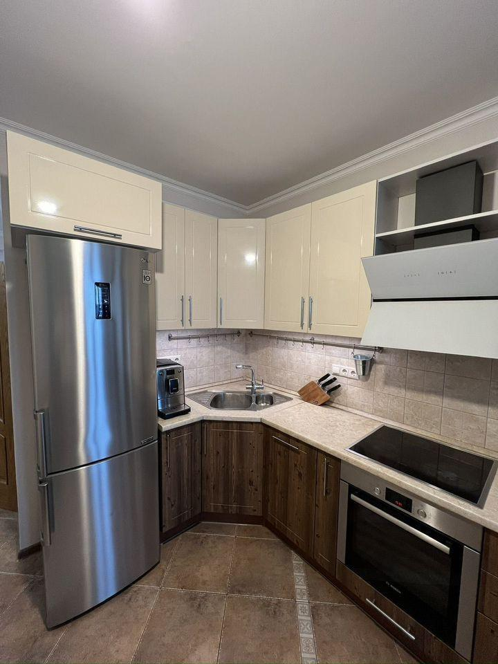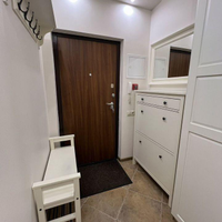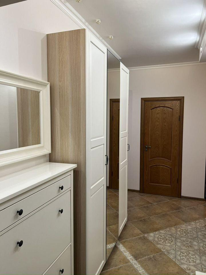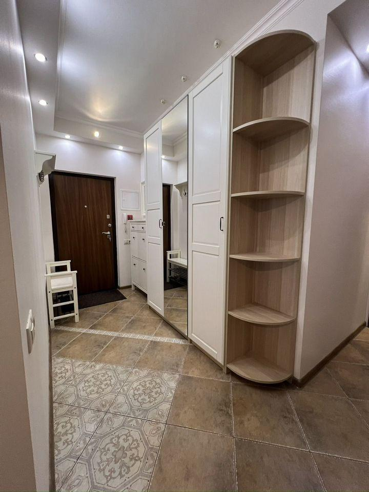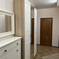 В квартире остается мебель и техника: шкафы в прихожей — IKEA, шкаф в спальне — IKEA, стол и стулья — IKEA, тумбочка под телевизор — IKEA, кровать с матрасом — Askona, диван — «8 марта», холодильник — LG, духовка и варочная панель — Bosch, посудомоечная машина — Hansa, телевизор — Samsung, кондиционер — Ballu, кухонный гарнитур со встроенной вытяжкой.